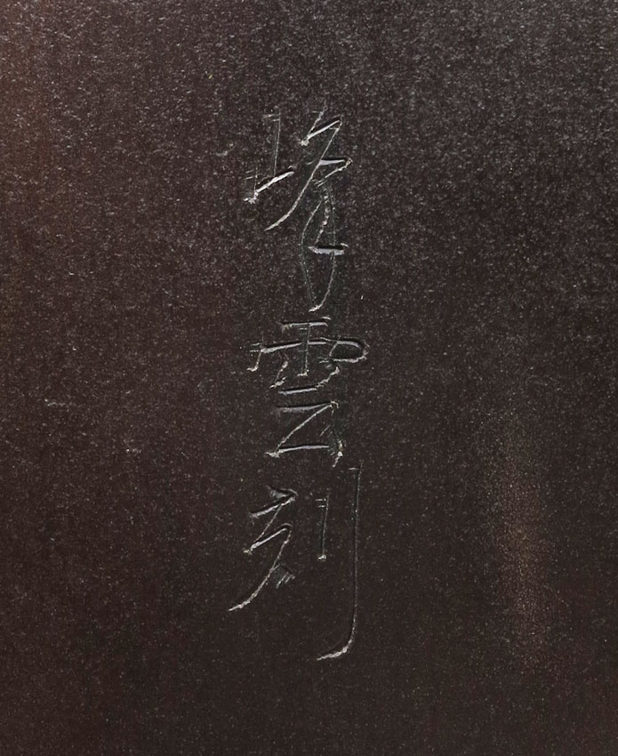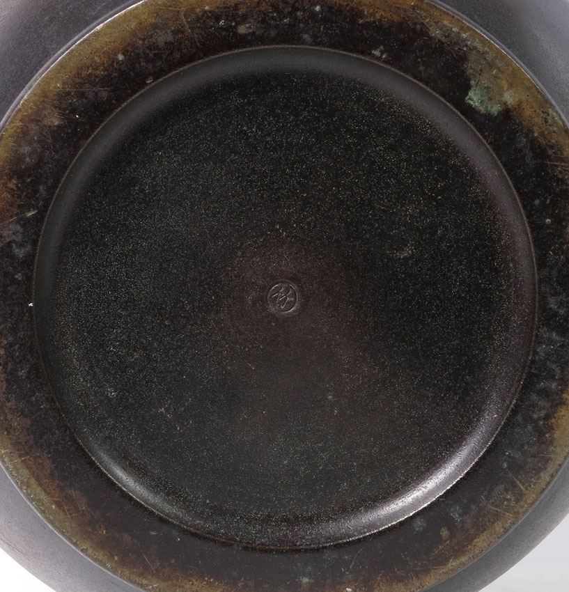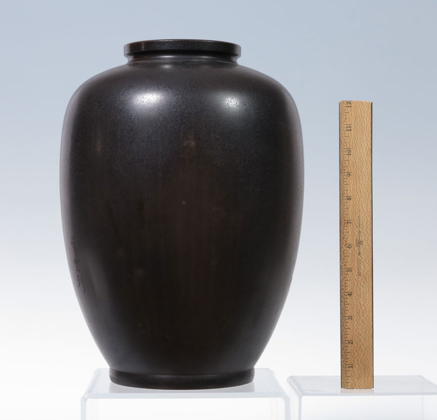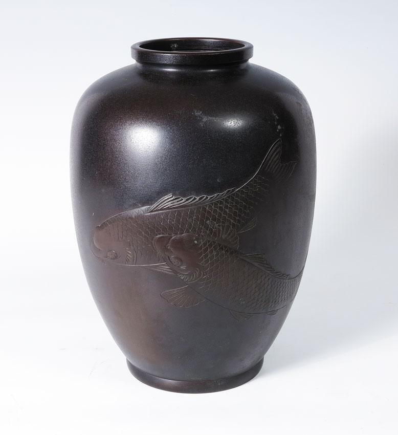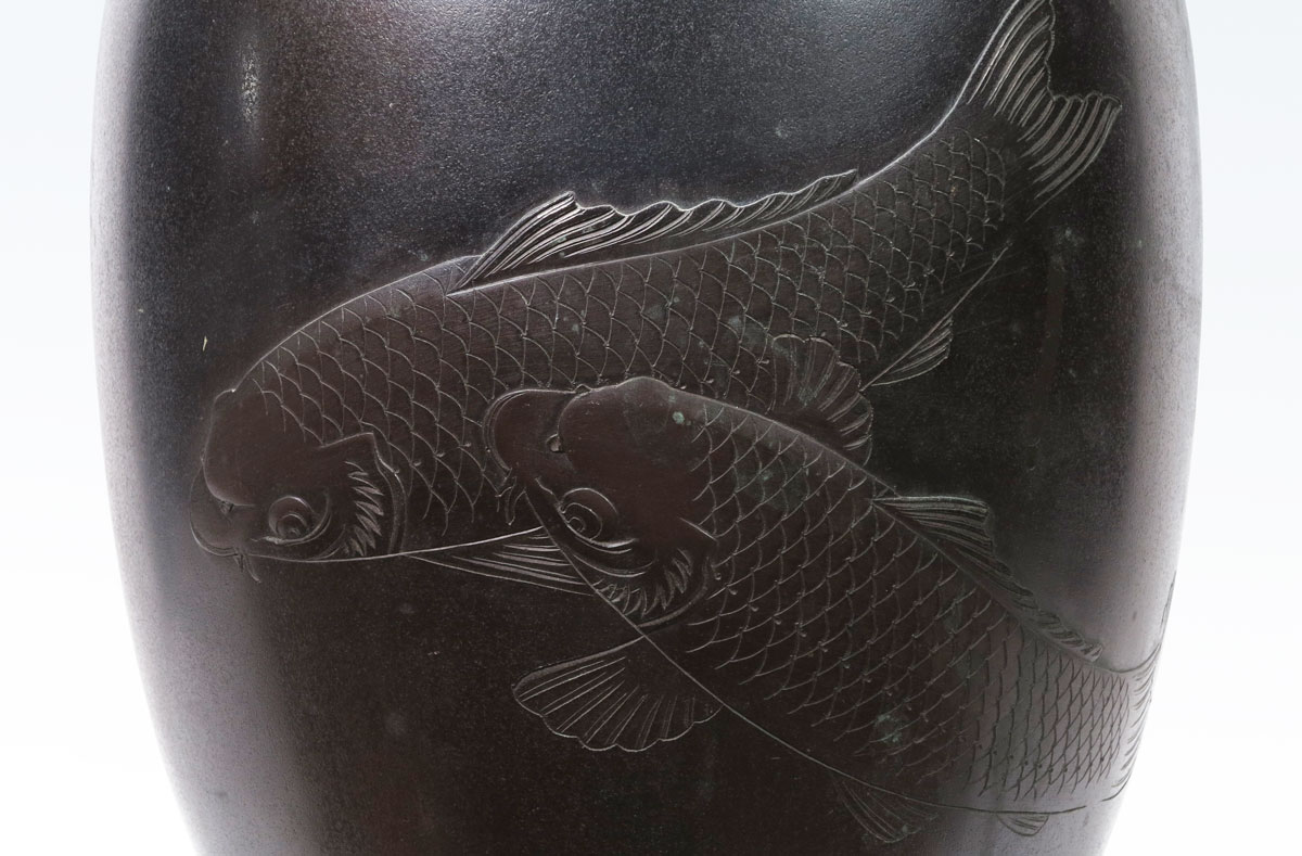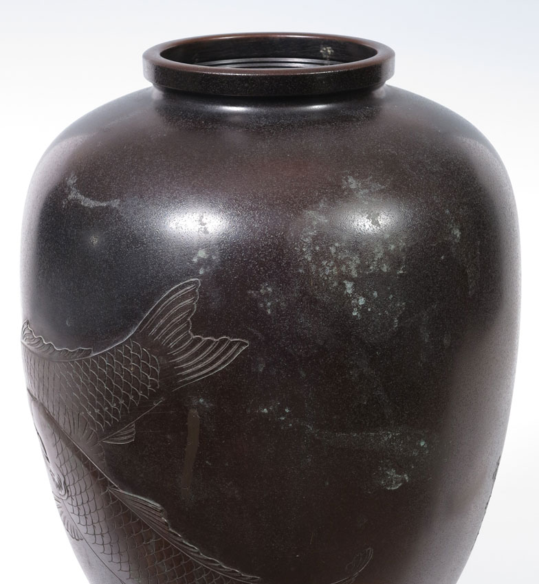 SIGNED HOUN JAPANESE BRONZE VASE WITH KOI DECORATION: Figures of 2 koi fish and signed Houn. Actual age unknown. 14 1/2'' h. x 10''.