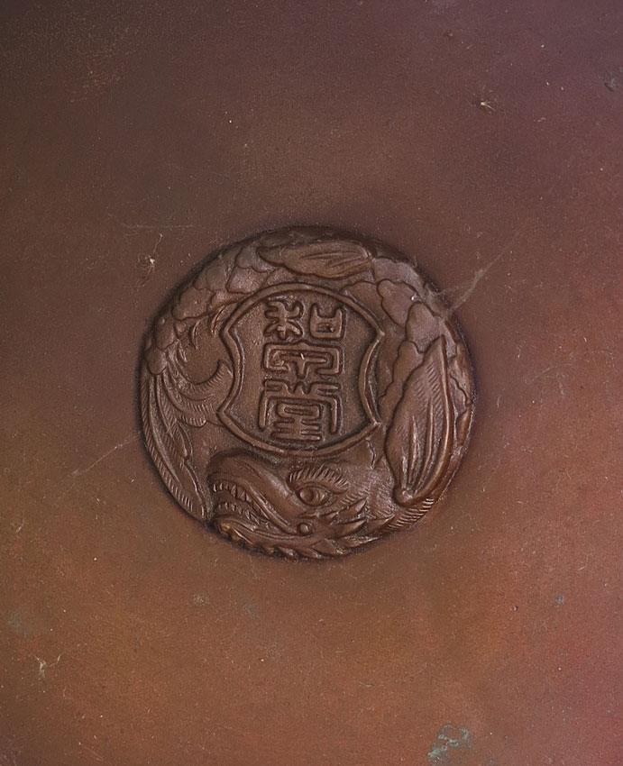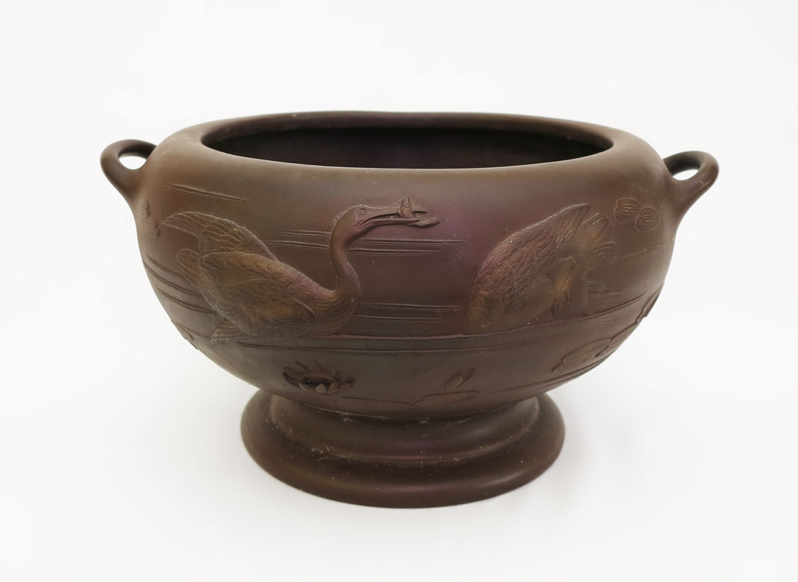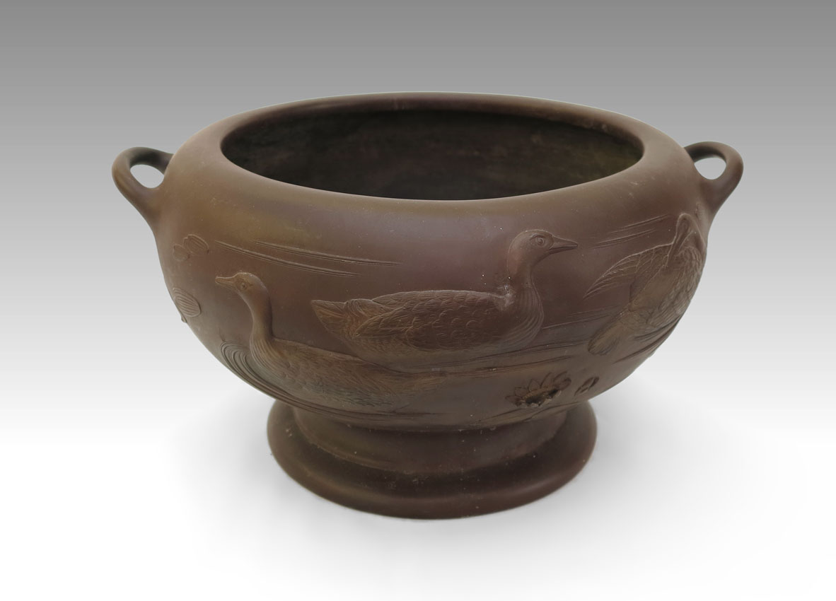 19TH C JAPANESE DOUBLE HANDLE JARDINIERE: Embossed duck motif. Bronze (?) Foundry mark. 9'' h. x 16 3/4'' dia. From the Estate of John Desmond and his wife Janina Hardoon Desmond.