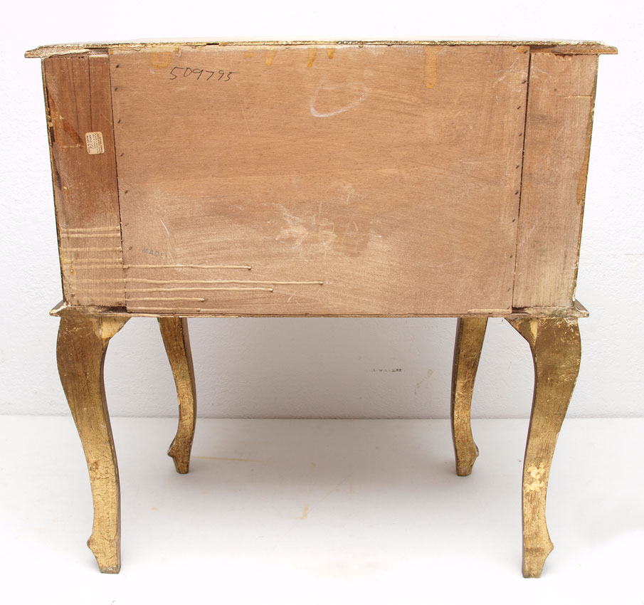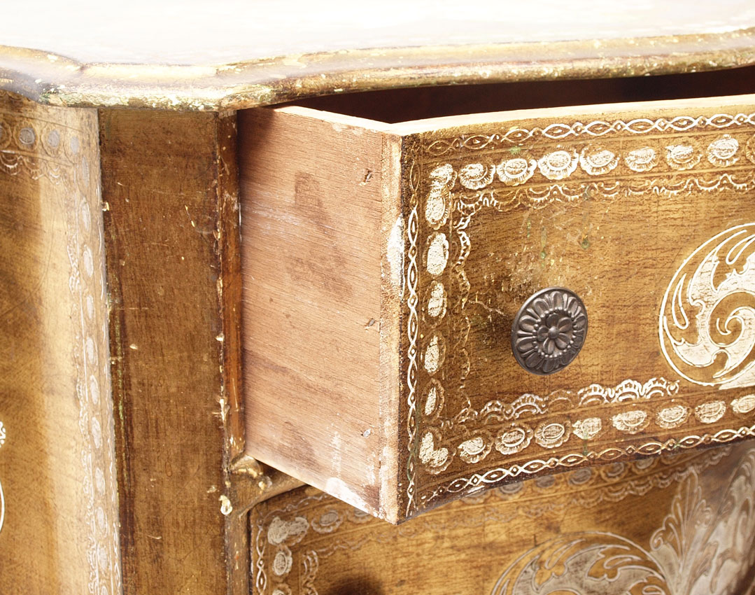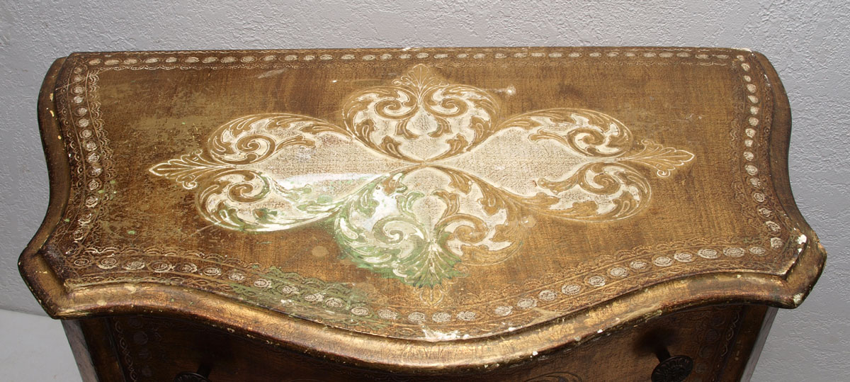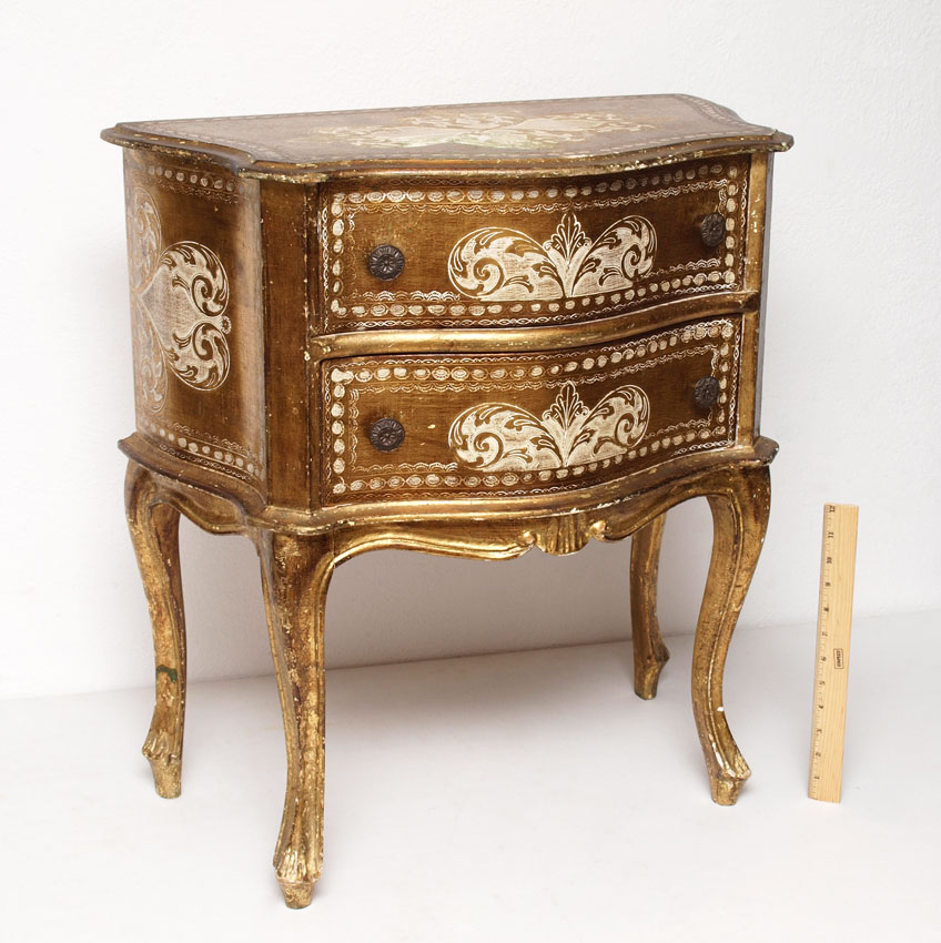ITALIAN FLORENTINE 2 DRAWER STAND: Stamped ''Made in Italy''. Chippy paint, serpentine front. Approx. 25 1/2'' tall x 24'' x 13''.