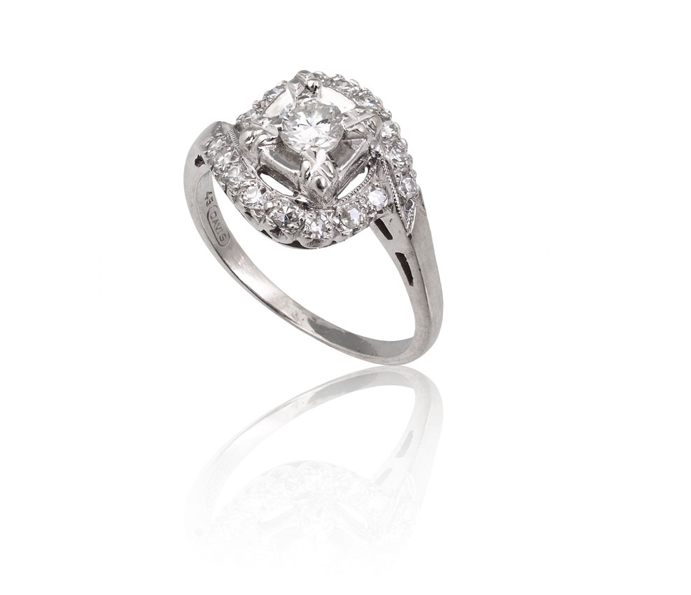 14K .50 CTW DIAMOND RING: 14K white gold ring contains 1 round brilliant and 16 round single cut diamonds totaling approx. .50 Ct. rated VS in clarity and G-H in color. The diamonds are prong set. Weight: 3.0 grams. Size: 6.5