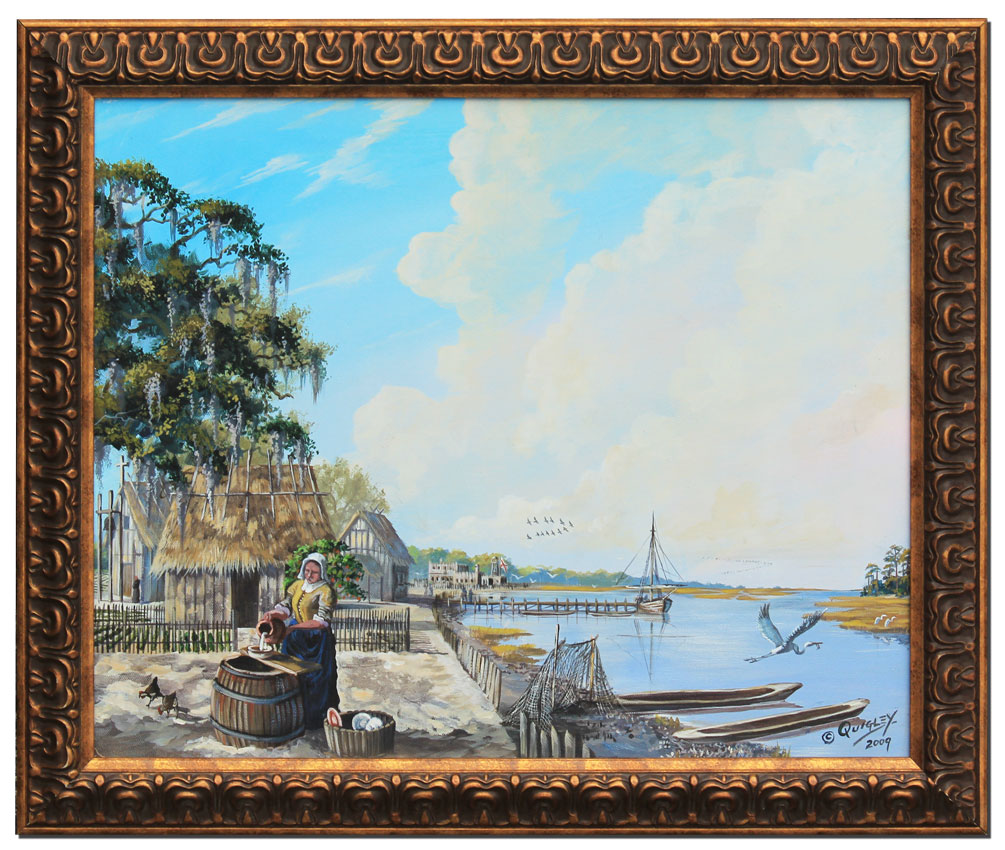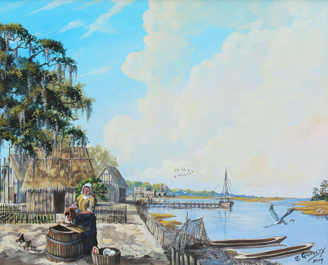QUIGLEY, Dean, (American, 20th Century): Early St. Augustine Settlement, Oil/Canvas, 16'' x 20'', signed lower right, dated 2009, framed 19 1/2'' x 23 1/4''.