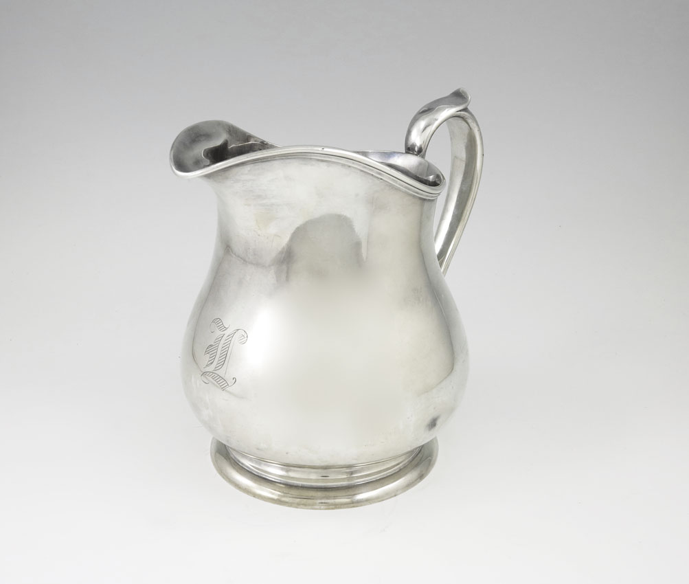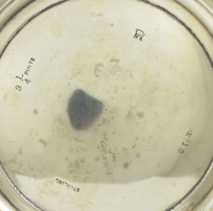 ROGER WILLIAMS STERLING WATER PITCHER: Monogrammed, marked with RW, 3 1/4 pints, Sterling, E13. 7'' h. x 7 3/4''. Approx. 19.2 troy oz.