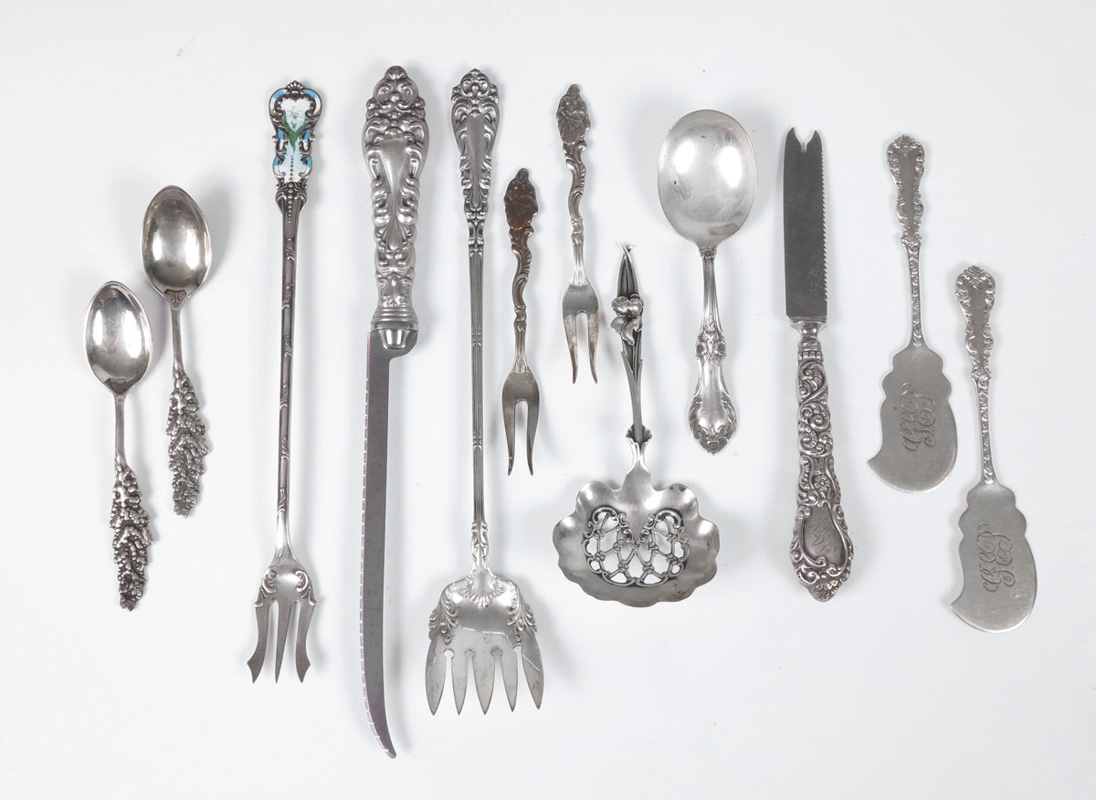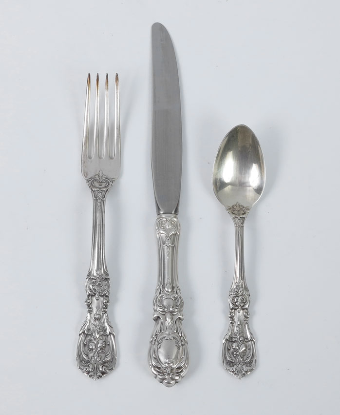 REED & BARTON FRANCIS I STERLING FLATWARE SERVICE: Approx. 80 pieces in the Francis I pattern by Reed & Barton to include 11 forks (7 1/4''), 11 salad forks (6 1/8''), 22 teaspoons (5 7/8''), 11 soup spoons (6''), 11 hollow knives (8 7/8''), 11 hollow butter knives (6 3/8''), child's spoon (4 5/8''), tablespoon (8 3/8''), cold meat serving fork (9 1/8''). No monograms. Sold with 12 pieces by assorted makers to include bon bon spoon, pickle forks, fruit knives, demitasse spoons, and butter knives. Silver chest 3 1/4'' h. x 16'' x 11 1/2''. Approx. 101.1 troy oz.