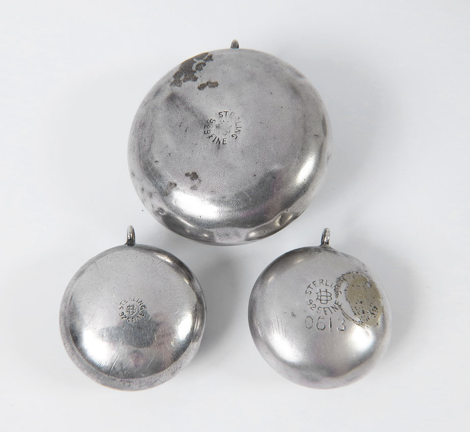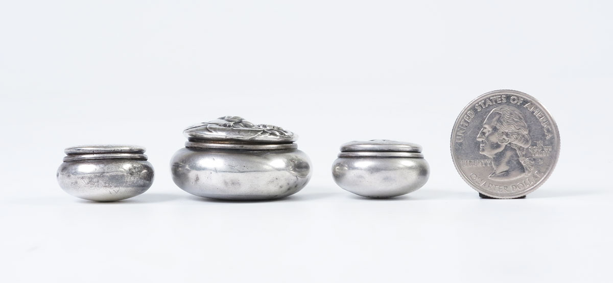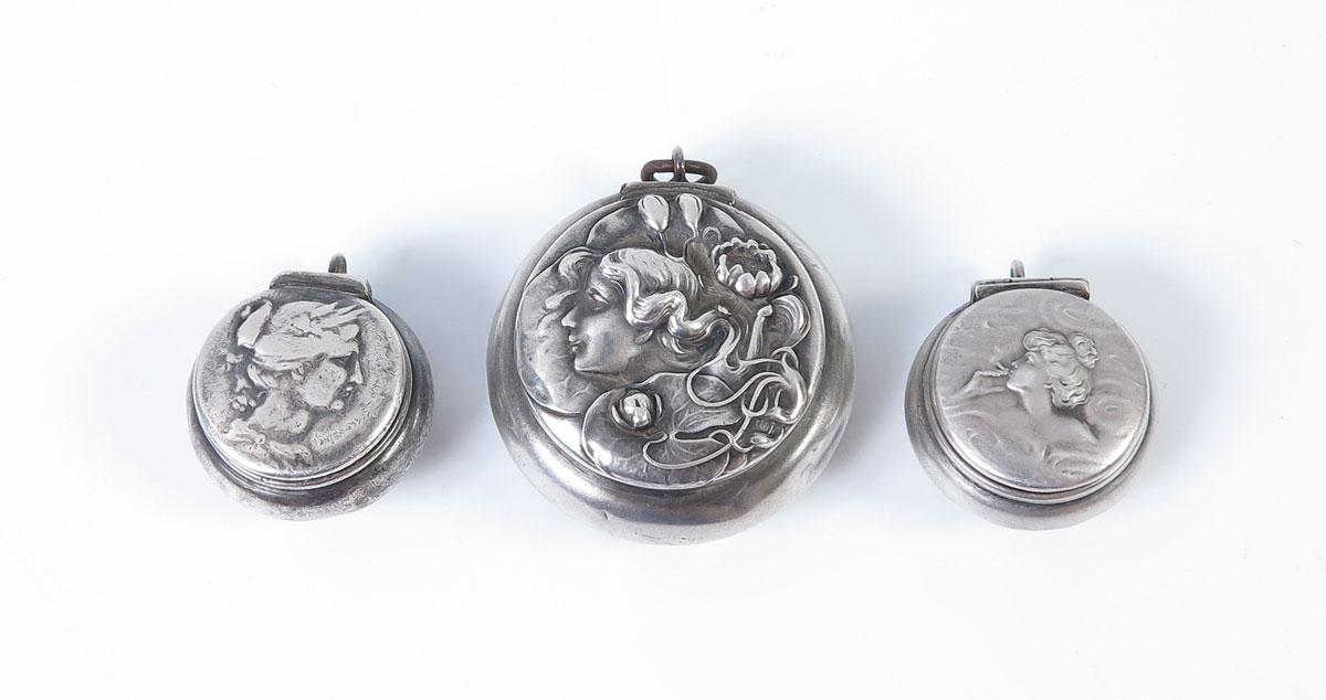 3 PIECE UNGER BROTHERS STERLING PILL BOXES: To include 1) Woman with flowers, hinged lid, ring to attachment to chatelaine. 1 1/4'' dia. 2) Smoking woman, hinged lid, 7/8'' dia. 3) Woman profile, hinged lid, 7/8'' dia.