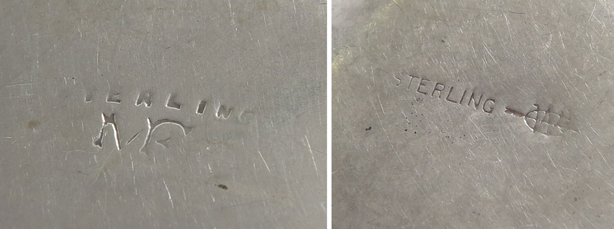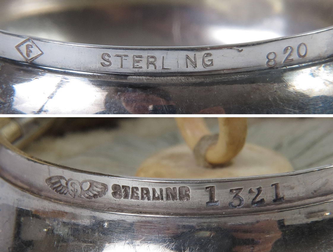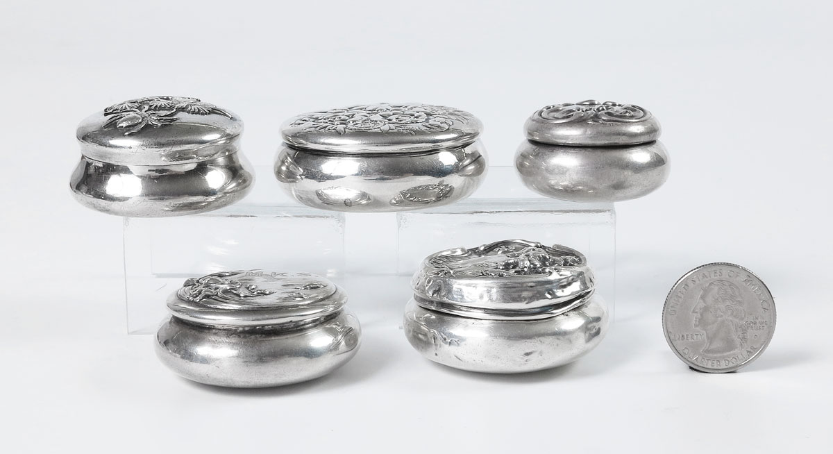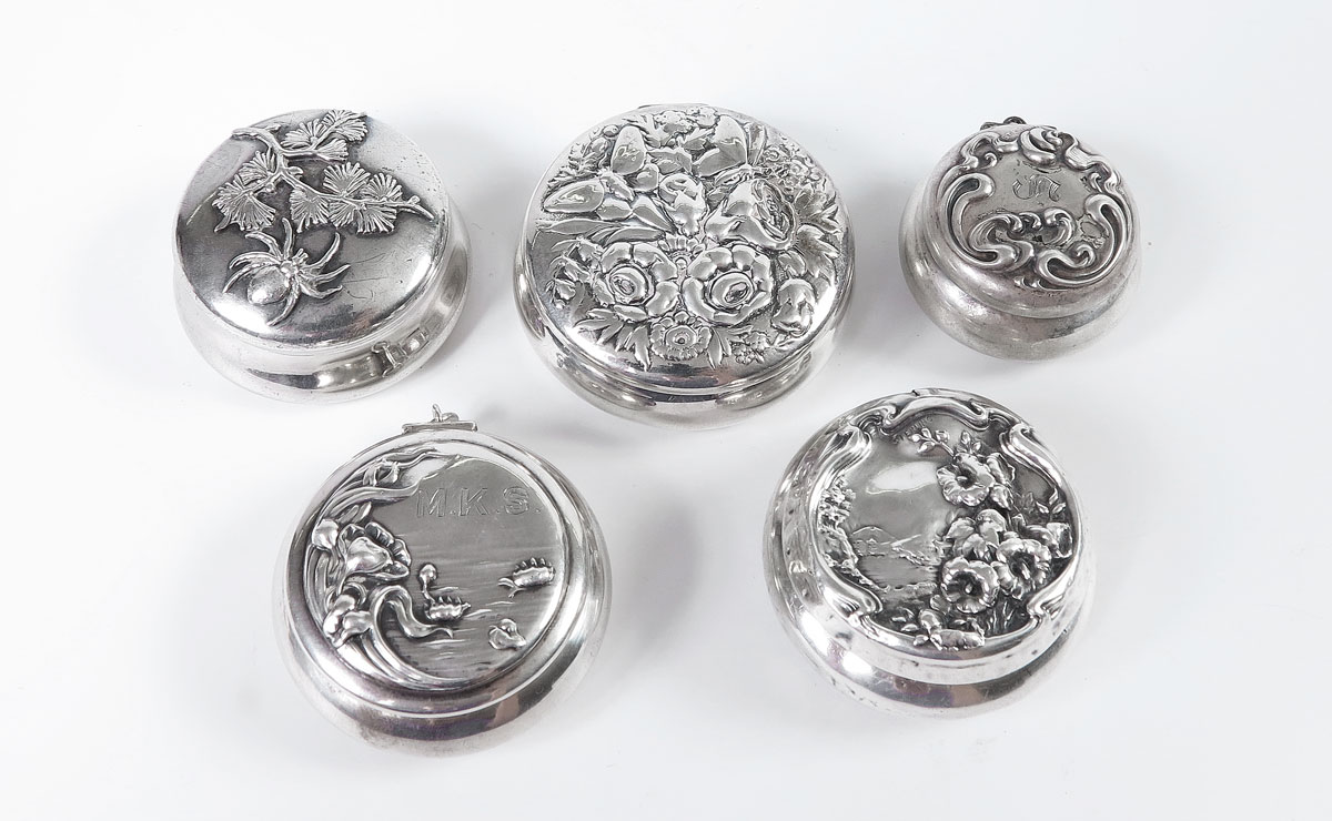 5 PIECE ART NOUVEAU STERLING PUFF BOXES: To include 1) Shiebler spider and branch, hinged lid, original puff. 2) Unidentified maker F in diamond floral hinged lid, hinge broken, 7/8'' h. x 2'' dia. 3) Marshall Field water lily hinged lid, monogrammed. 4) Webster art nouveau lines, hinged lid, monogrammed. 5) Floral snap lid, note damage. Approx. 3.8 troy oz.
