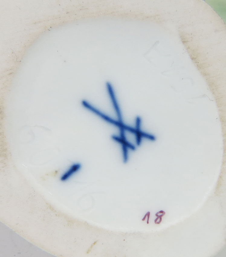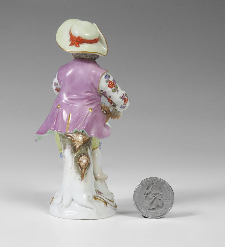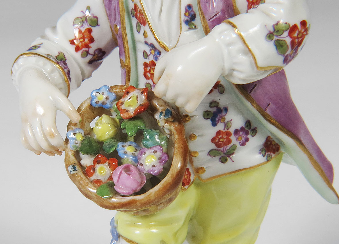 MEISSEN GERMAN PORCELAIN FIGURE: Young boy with flower gathering basket, 4 1/2'' tall. Blue cross sword mark under glaze.