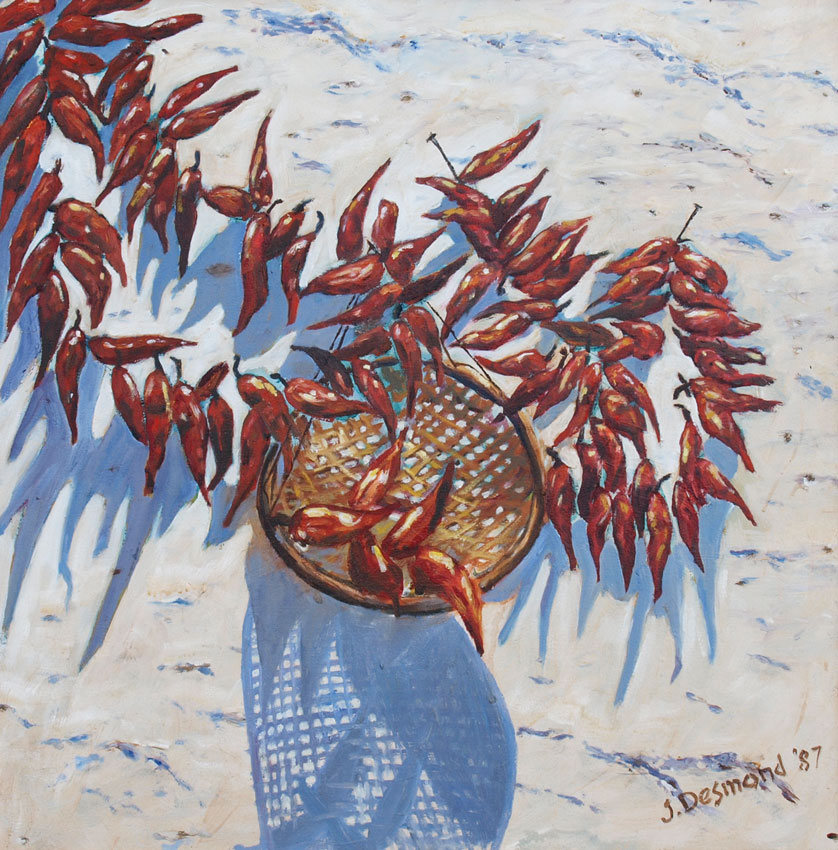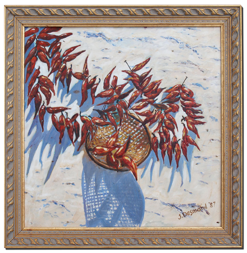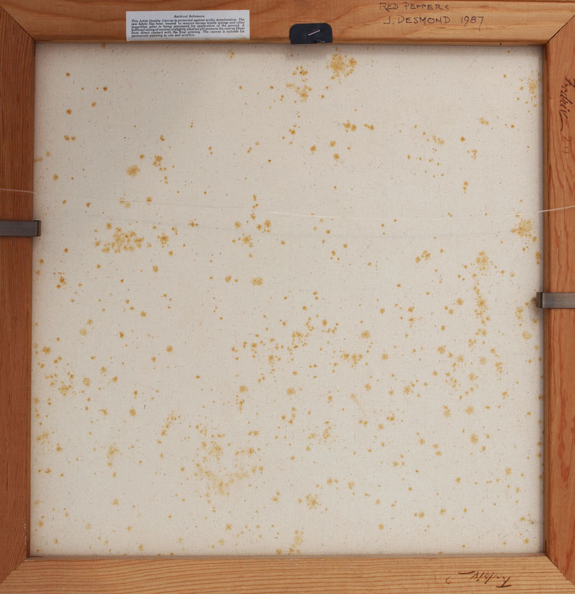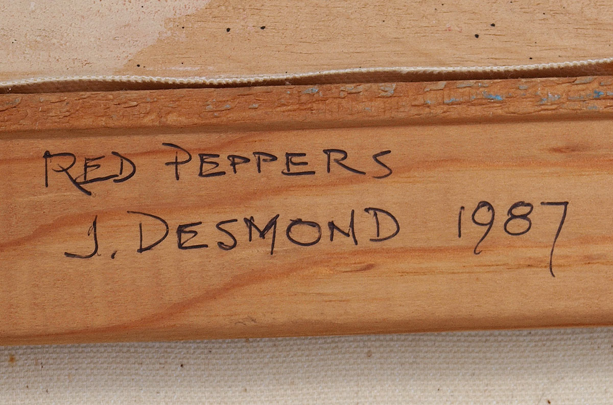 DESMOND, John Justin, (American, 20th Century): ''Red Peppers'', OIL/Canvas, signed lower right and dated '87, titled in pen on frame verso. 20'' x 20'', contemporary gilt wood frame 23 1/4'' x 23 1/4''. Direct from the artists estate.