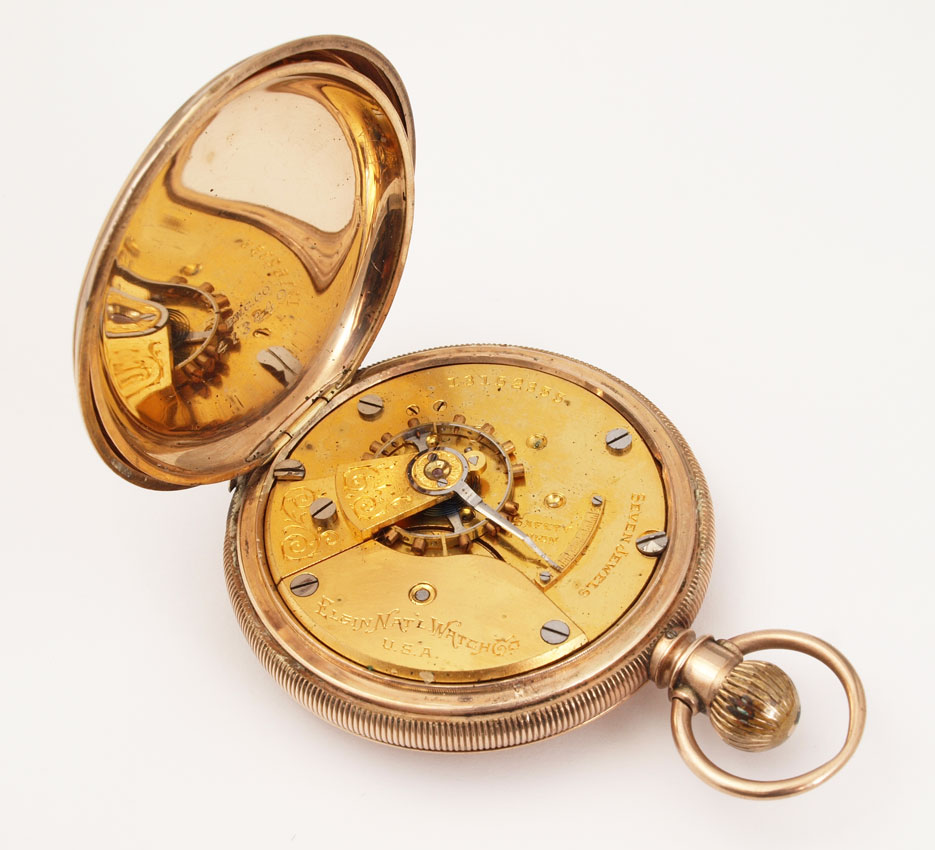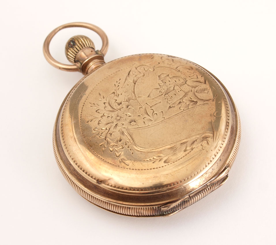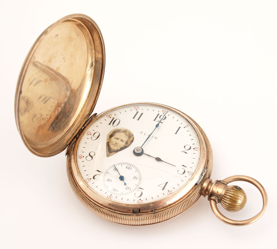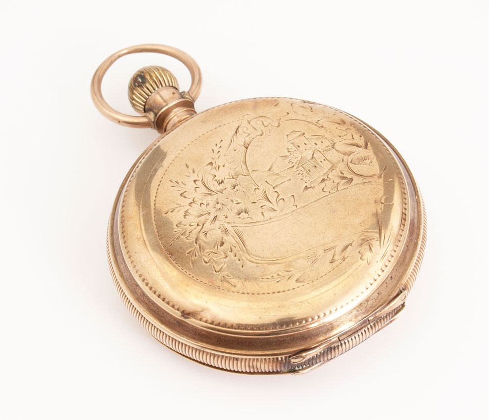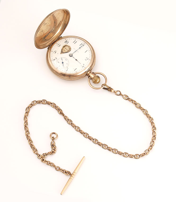 ELGIN HUNTERS CASE POCKET WATCH CA. 1900: Gold filled size 18 case, engrave design, no monogram. 7 jewel mechanical lever action movement, not working. Serial number 13152355. Railroad style spade markers and photo place on the dial. Original ball style crown. Gold filled anchor style chain with bar.