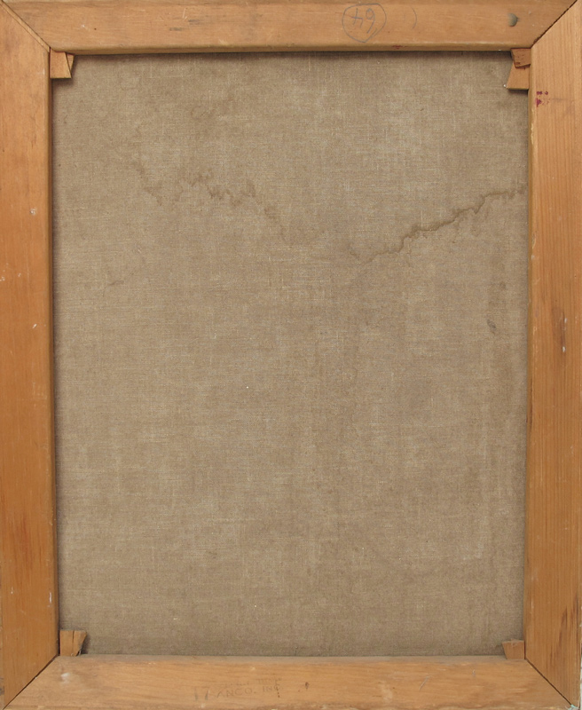 CONDITION: Needs to be re-stretched and cleaned. Exhibits areas of craquelure, paint flecking in the lower margin, as well as paint overspray. Sold as is.