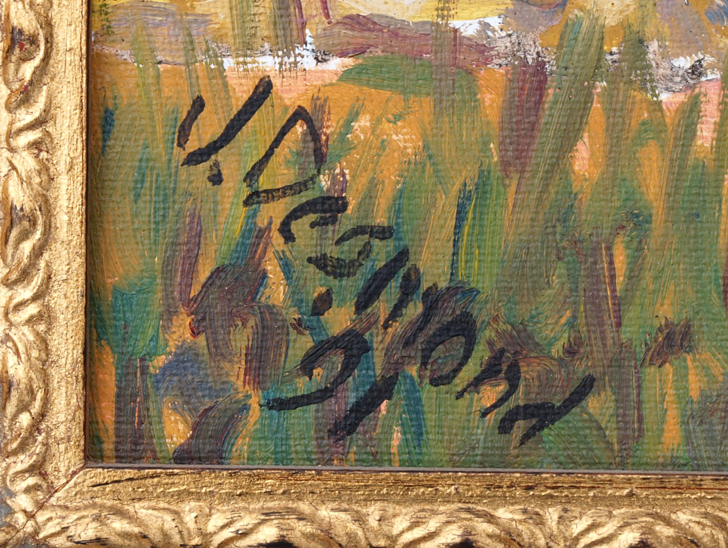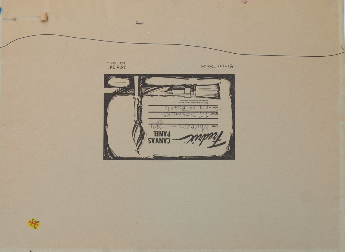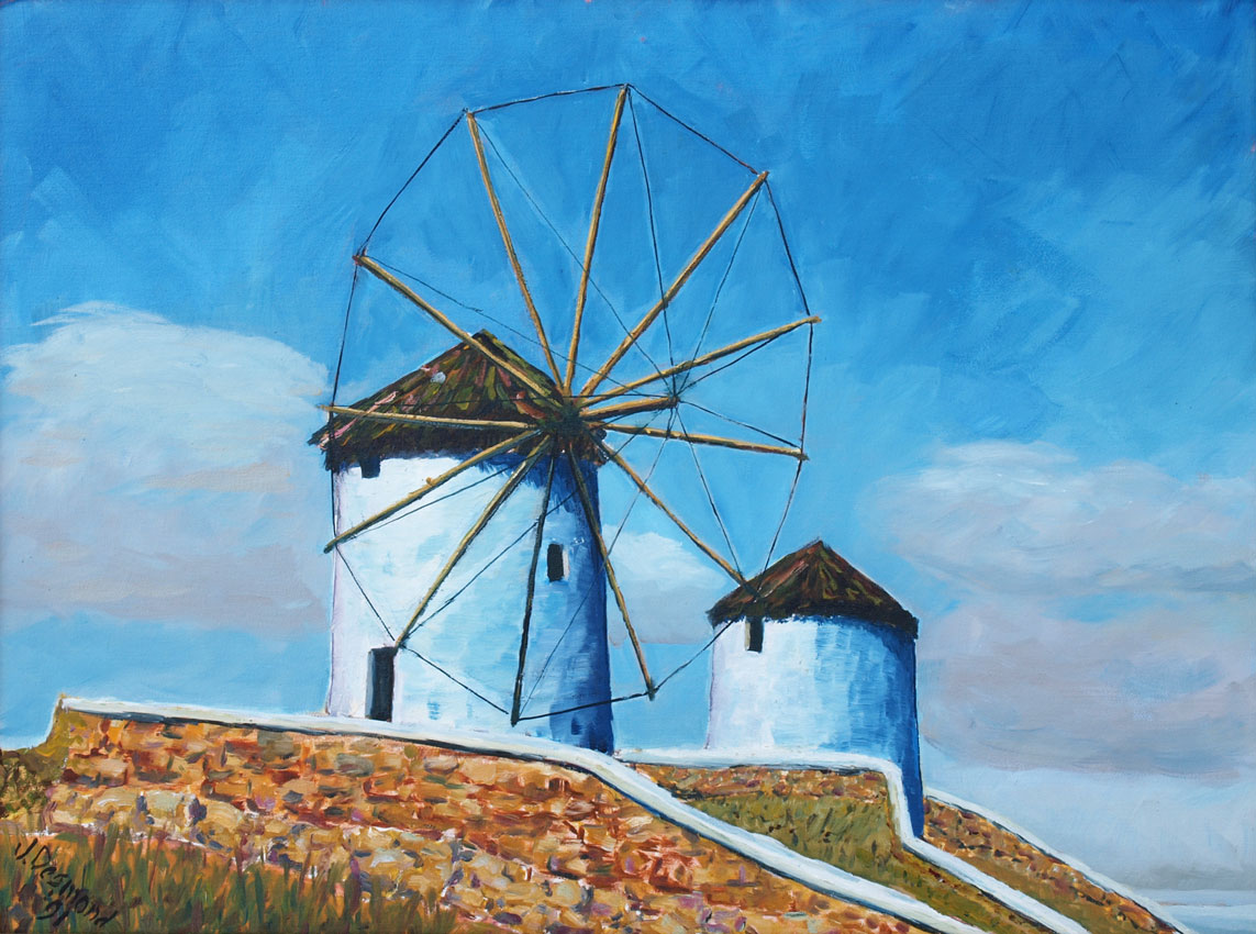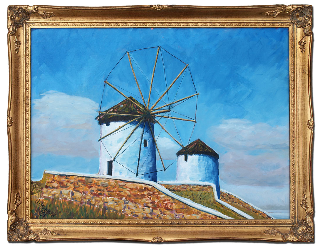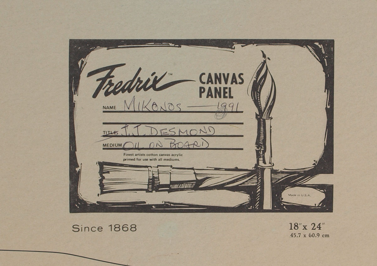 DESMOND, John Justin, (American, 20th Century): ''Mikonos'', landscape with windmill and other building, Oil/Canvas Board, signed lower left dated '91, titled verso. 18'' x 24'', contemporary gilt wood frame, 21 1/2'' x 27 1/2''. Direct from the artist's estate.
