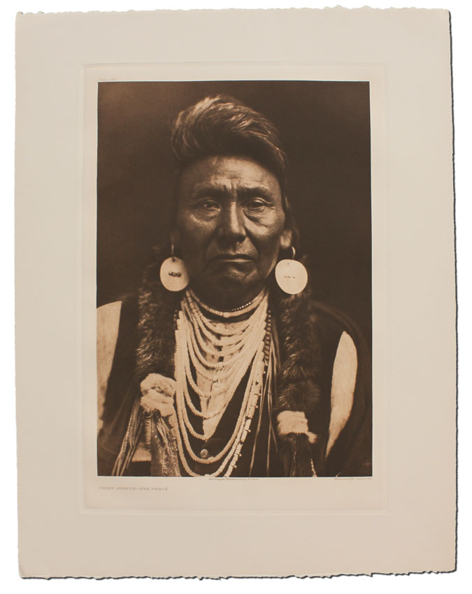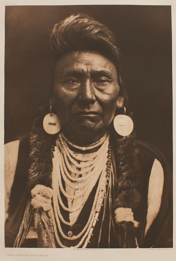 CURTIS, Edward, (American, 1868-1952): ''Chief Joseph-Nez Perce'', Photogravure, 22 1/4'' x 17 3/4'', titled lower left, #'d plate 256 upper left, from copyright photograph 1903 by E. Curtis, photogravure by John Andrew & Sons, unframed. Finely printed from the original plate in 1982 by master printmaker, author and teacher Deli Sacilotto, edition size less than 15.