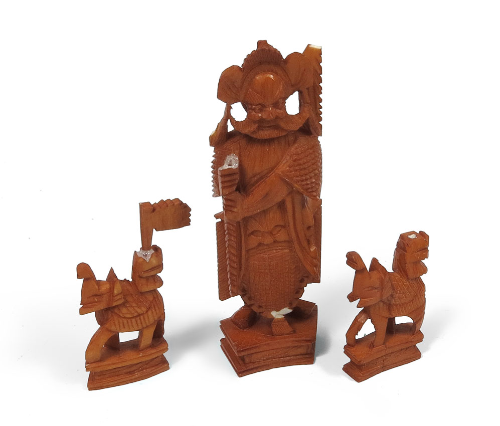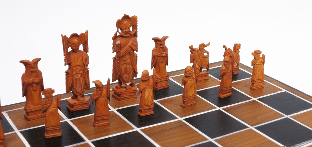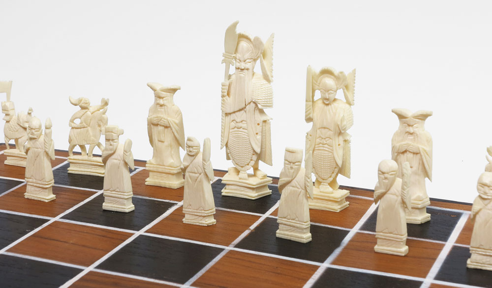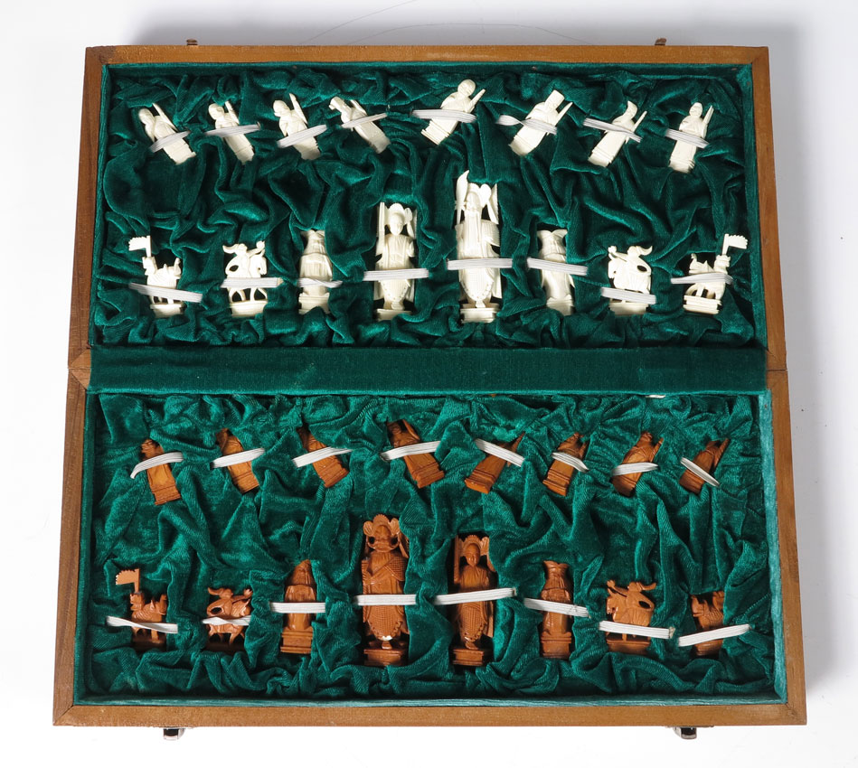 CHINESE CARVED IVORY CHESS SET: Complete set with figures and animals. Kings measures 3 3/4'' h. Sold in chess board case, 3 1/4'' h x 16'' x 8''.