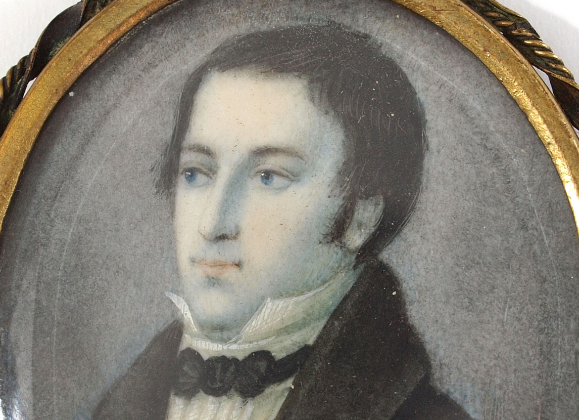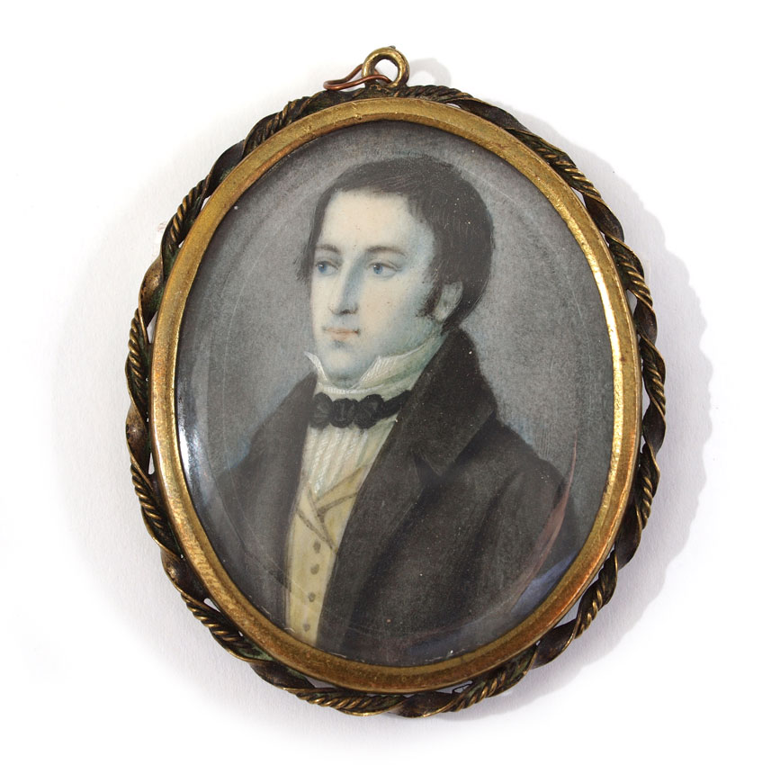 MINIATURE WATERCOLOR PAINTING OF A GENTLEMAN: Oval sight size 1 3/4'' x 1 3/8'', no visible signature, encased in period gilded metal frame, 2 1/4'' x 1 3/4'', with a tortoise shell backing.