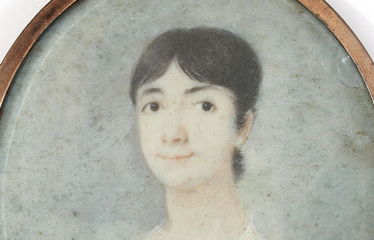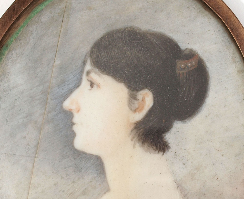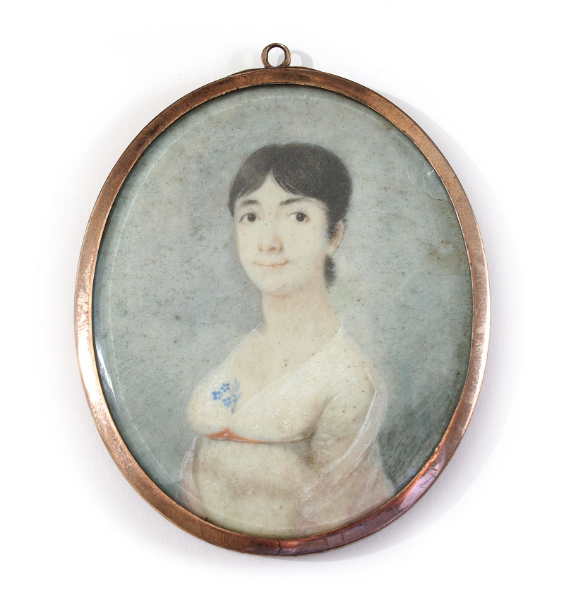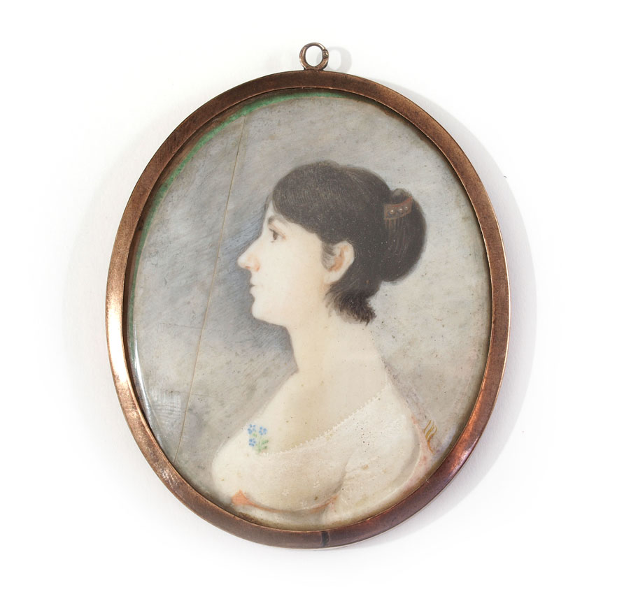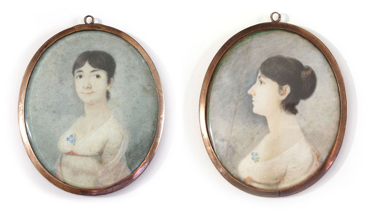 TWO 19TH CENTURY MINIATURE PORTRAIT PAINTINGS ON IVORY OF TWO YOUNG LADIES: Oval sight size 2 1/2'' x 2'', encased in a metallic frame, 2 5/8'' x 2 1/4'', both pictures are unsigned.