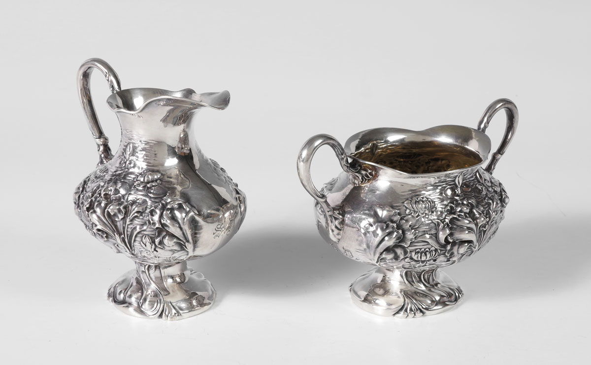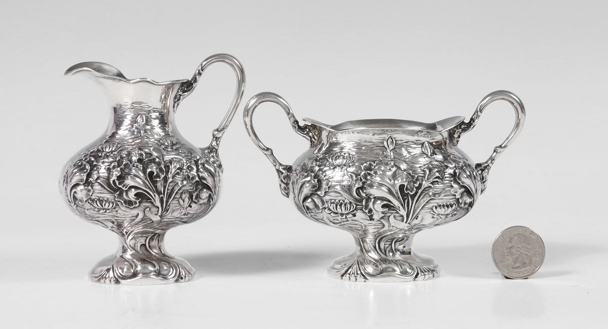UNGER BROTHERS STERLING ART NOUVEAU CREAMER AND SUGAR: Embossed pond and water lily pattern, open creamer and sugar, marked with Unger Brothers, 8089 and 8090. Creamer 3 1/4'' h. x 5''. Approx. 5.1 troy oz.