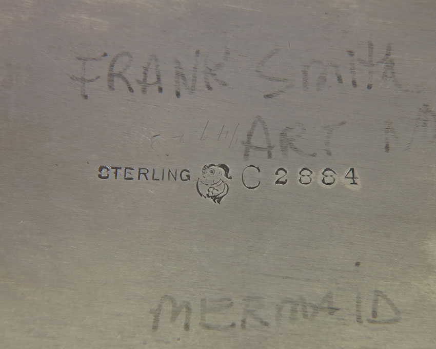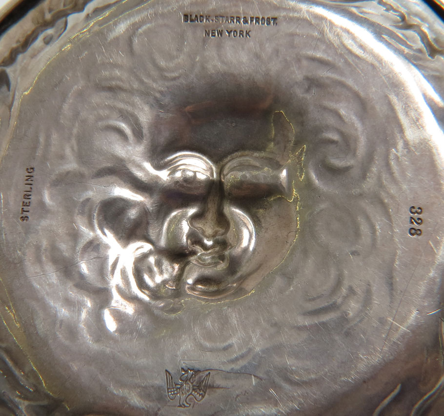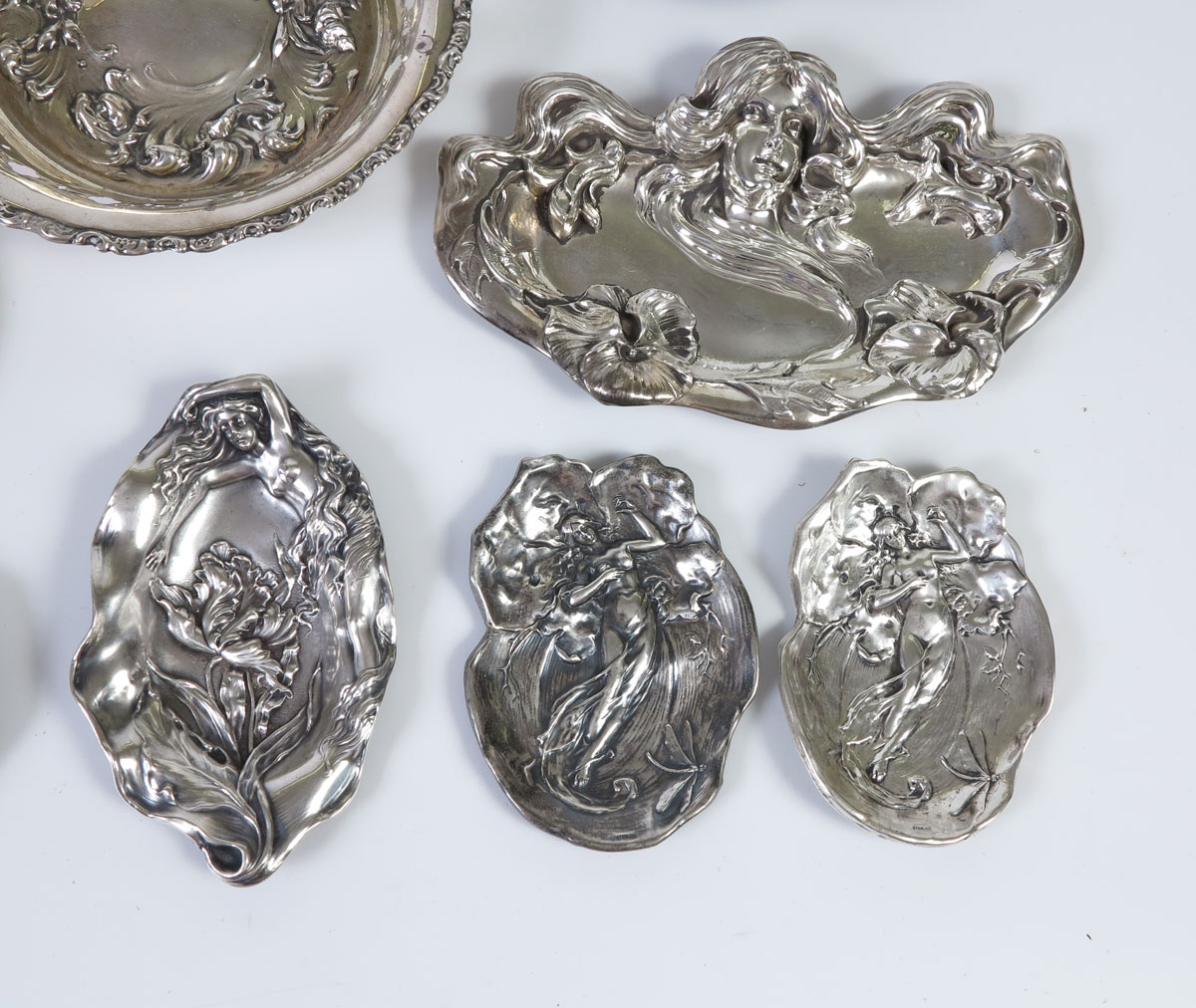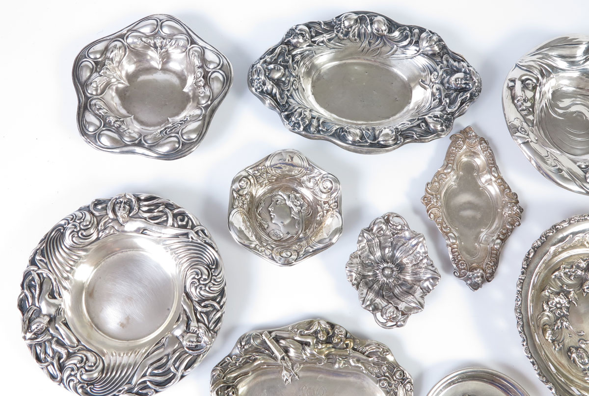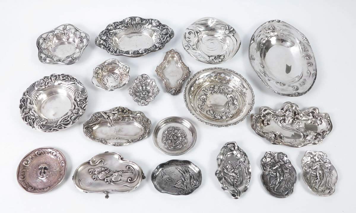 18 ART NOUVEAU STERLING TRAYS: To include 1) Alvin with 3 figural women's bust. 2) Mauser floral pattern. 3) Mauser with pierced sides, embossed woman and foliate scroll base. Note damage to side. 4) Mauser with woman on left with flowing hair and flowers. 5) Reed & Barton ''Clematis'' flower. 6) 2 women's full figure at center with dragonfly. 7) Woman full figure with flower at center. 8) Mauser embossed woman's head in profile at bottom. 9) Kerr woman's head with flowers at center. 10) Black, Starr and Frost smoking man at center. 11) Park Brothers scarab and flowers. 12) Kerr with masquerons and cherubs at corners. 13) International Silver mermaid with waves 9 3/8'' x 6 1/2''. 14) Women's heads at either end with floral rim. 15) Kerr woman's head with flowers. 16) Woman with cupid and arrows, floral rim. 17) Footed tray with 3 horses. Several monogrammed. Approx. 36.9 troy oz.