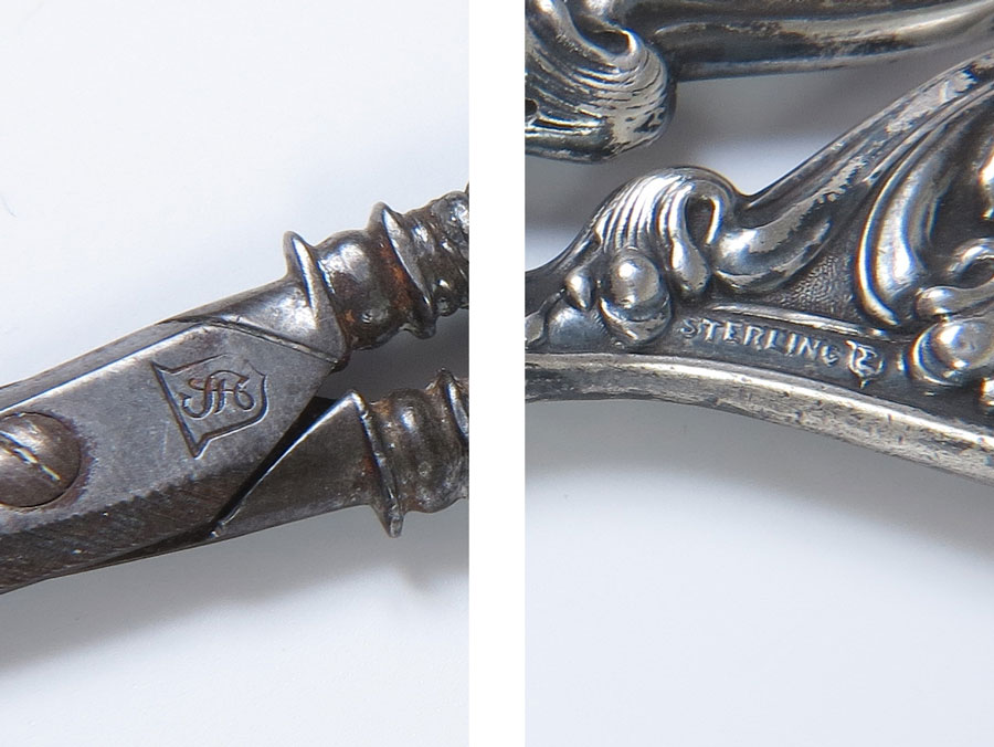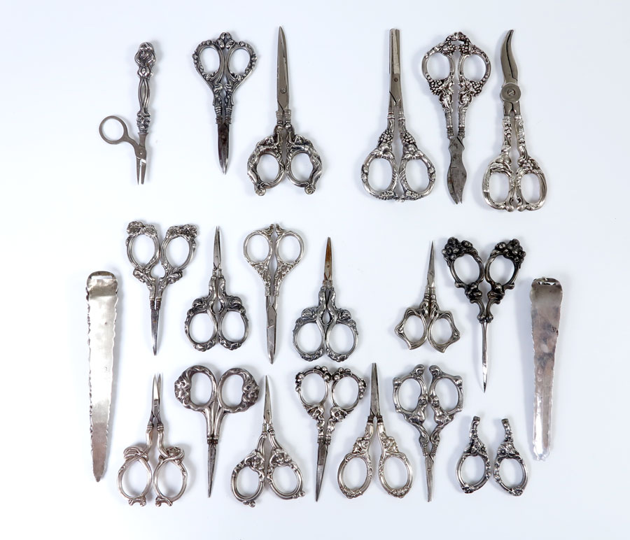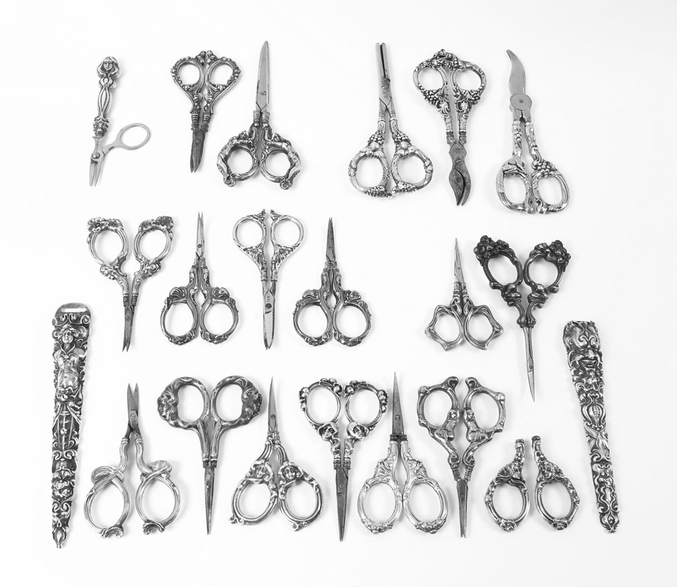 COLLECTION OF ART NOUVEAU STERLING SCISSORS: To include 1) 2 desk scissors, one Simons Brothers, other with full body women. 2) Unusual scissors with woman bust handle. 3) 4 floral handle sewing scissors. 4) Woodside Sterling floral handle sewing scissors. 5) Art nouveau lines handle sewing scissors. 6) 6 figural handle sewing scissors plus one set of handles without blades. 7) 3 grape shears, one Unger Brothers, another with fox or dog, last with all grape motif. 8) Pair Unger Brothers knife sheaths, one figural woman 6 1/2'', other masqueron.