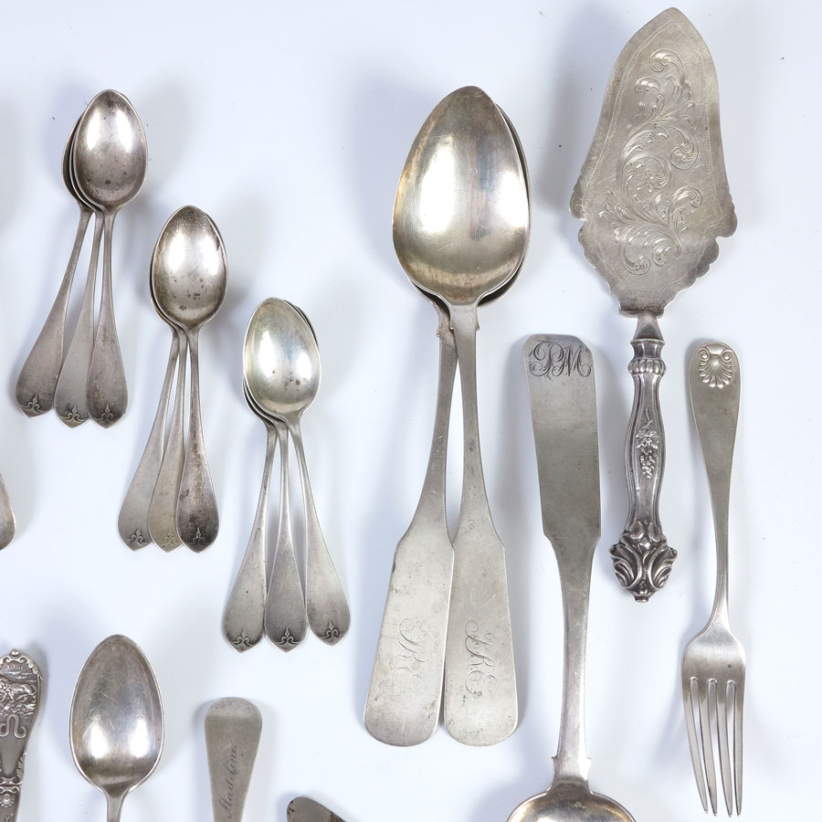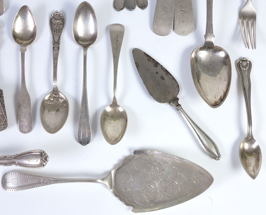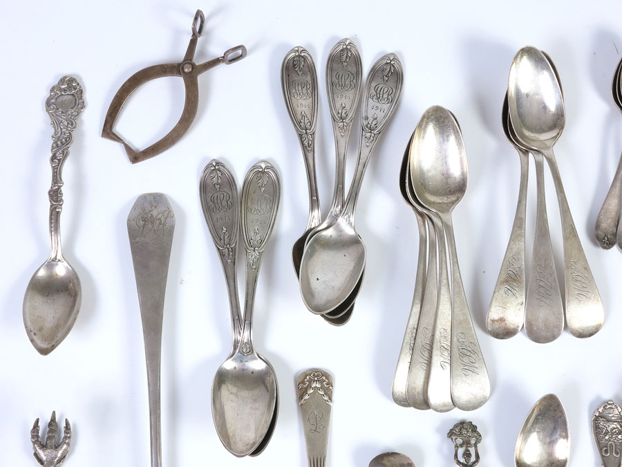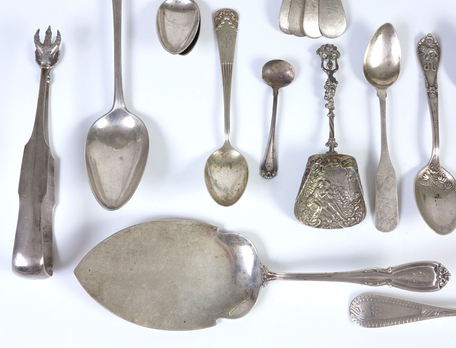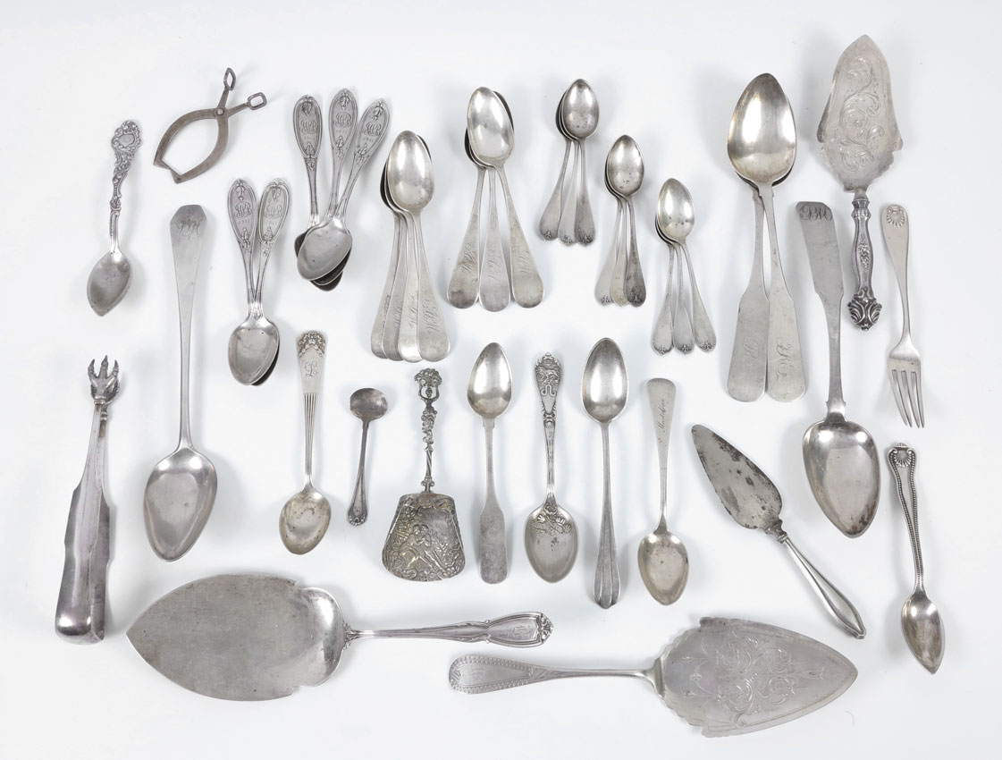 ASSEMBLED COLLECTION OF STERLING & COIN SILVER FLATWARE: Sterling pieces to include items from makers Gorham, Durgin, Frank W. Smith & others. Coin silver to include makers T. A. Davis, Whiting, Fessenden Brothers, F. & H., J. Wood, N. Hardin and others. Approx. 19.6 troy oz. coin silver, 15.6 troy oz. sterling. Sold with monogrammed silver chest, 2 3/4'' h. x 15 1/4'' x 11 1/2''.