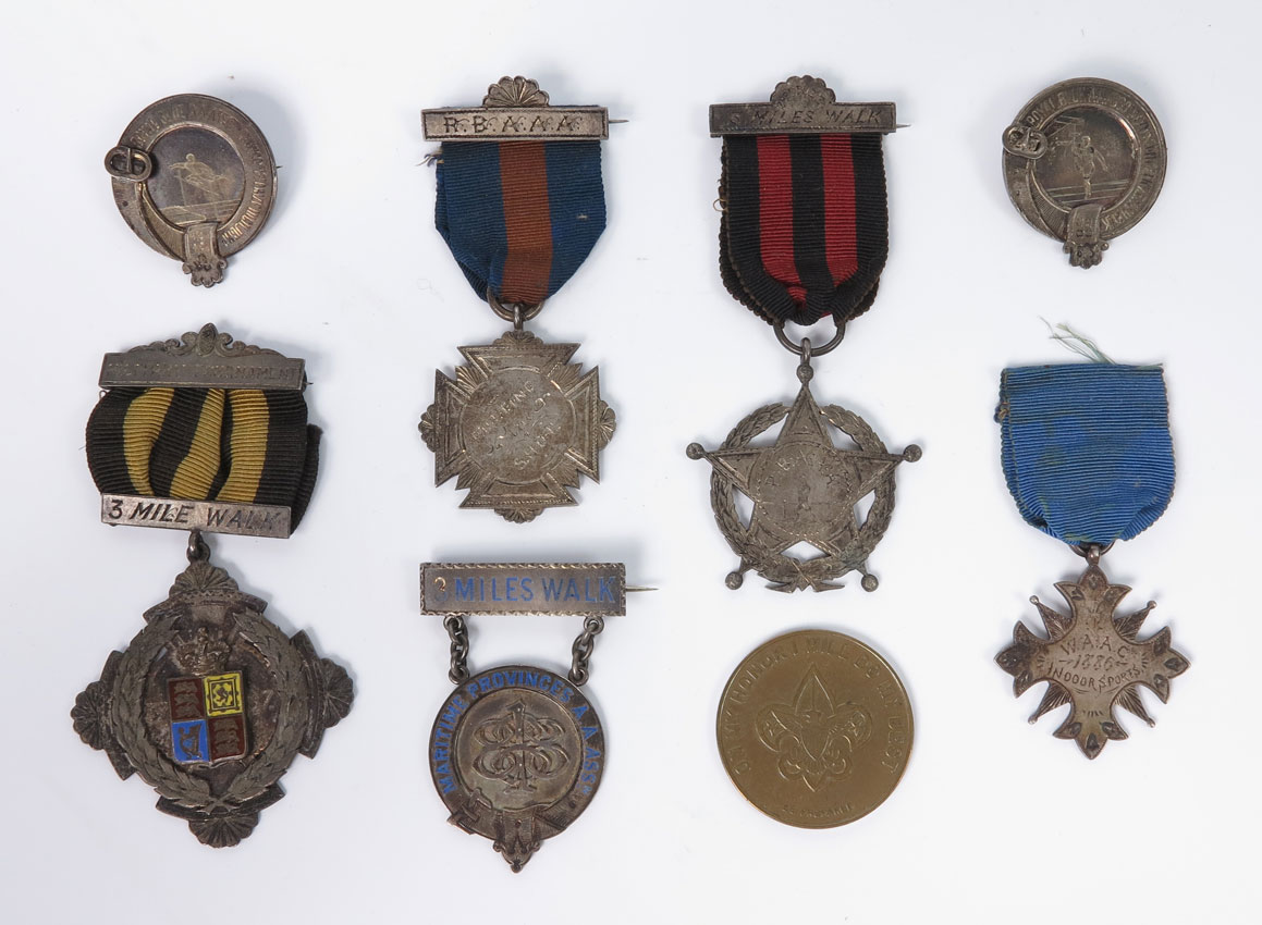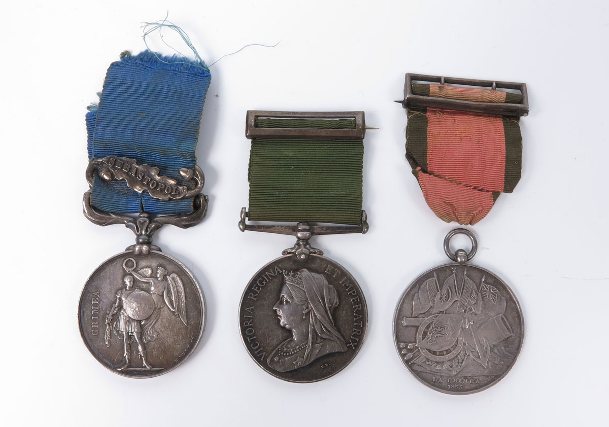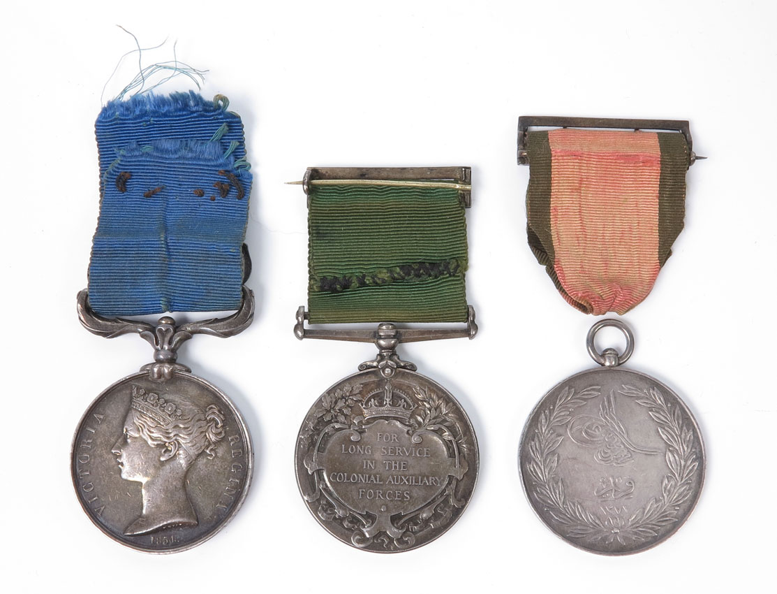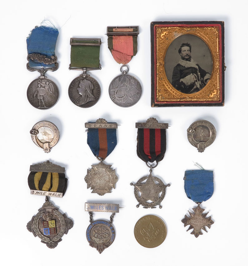 COLLECTION OF CRIMEAN WAR MEDALS & SPORTING MEDALS: To include 1) 2 Crimean War medals to include 1854 service medal with Sebastopol clasp presented to F. H. Horneman of the 62nd (Wiltshire) Regiment; 1855 Turkish Service medal, note ribbon has separated. 2) Edwardian ''For Long Service in the Colonial Auxillary Forces'' medal presented to Sergeant F. J. Horneman 66th Regiment. 3) Tintype photo of who we believe to be F. H. Horneman based on winter dress and style of sword in photograph. 4) Collection of late 19th century sporting medals which we believe to have been awarded to F. J. Horneman, but none marked as to recipient. 5) Boy Scout medallion of unknown vintage.