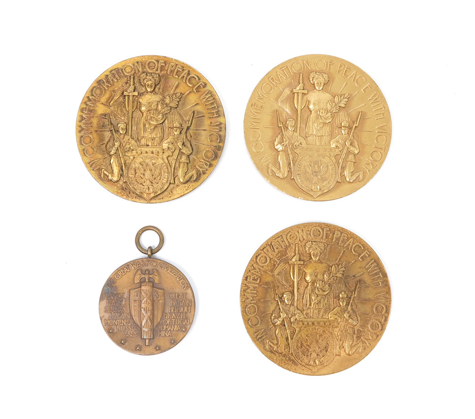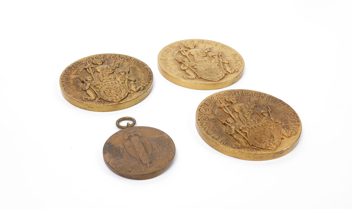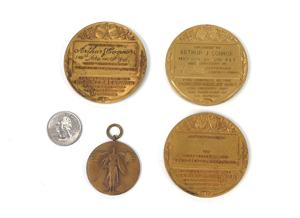 4 PIECE WWI MEDALS AND MEDALLIONS: To include 1) 3 ''In Commemoration of Peace with Victory'' medallions, 2 inscribed with Arthur J Conner, 140th Aero Squadron, one medallion presented by Hancock County, West Virginia the other from Jefferson County, Ohio. Both of these in original cases. Third medallion is not dedicated and from Hancock County, West Virginia. Each medallion 2 1/4'' dia. 2) US WWI Victory medal.