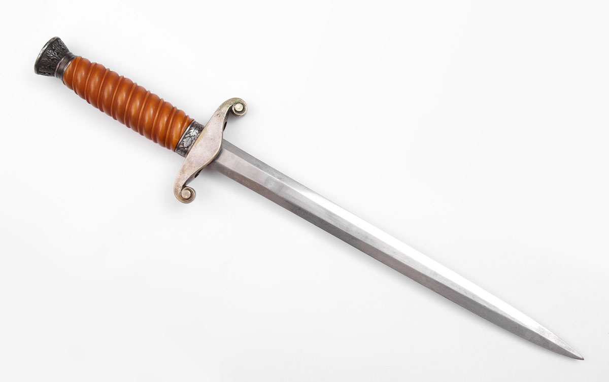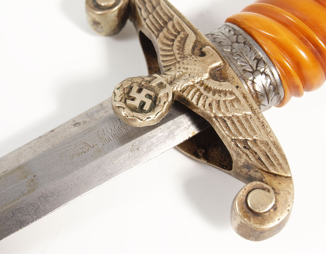 WWII HEER GERMAN ARMY DAGGER: Orange bakelite twist grip, Tiger Solingen 10'' blade. Overall 15 1/2''.