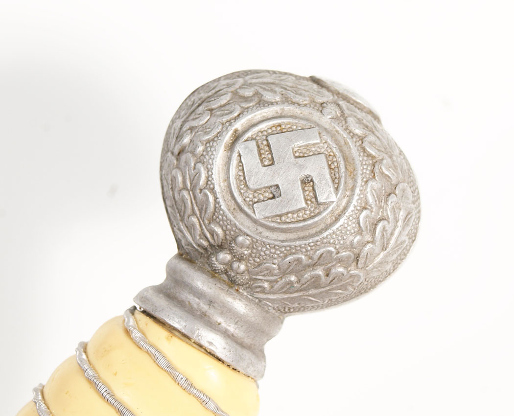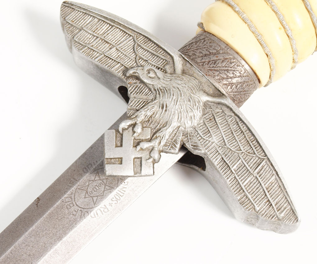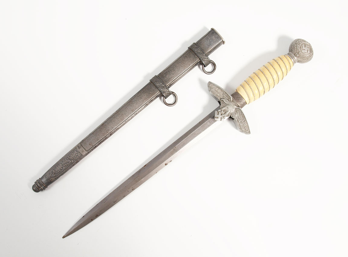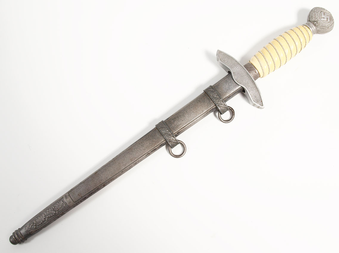 WWII GERMAN LUFTWAFFE 2ND MODEL DAGGER: Aluminum pommel and cross guard, ivorine grip with original wire. Rudolf Buchel 9 3/4'' blade. Original scabbard. Overall 16 7/8'' l.