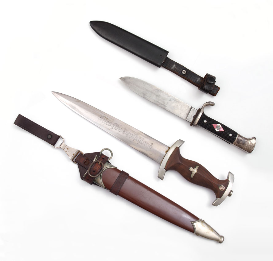 2 PIECE WWII GERMAN SA AND YOUTH DAGGER: To include 1) German SA dagger, wood grip with emblem and SA. Marked on cross guard Neh. Partial August Rother Solingen mark on 8 3/4'' engraved ''Alles fur Deutchland'' blade. Original scabbard with hanger. 14 3/4'' l. overall. 2) German youth dagger, emblem in hard rubber grip. 5 1/2'' blade marked RZM M7/51/39. Original metal scabbard. Overall 10''.