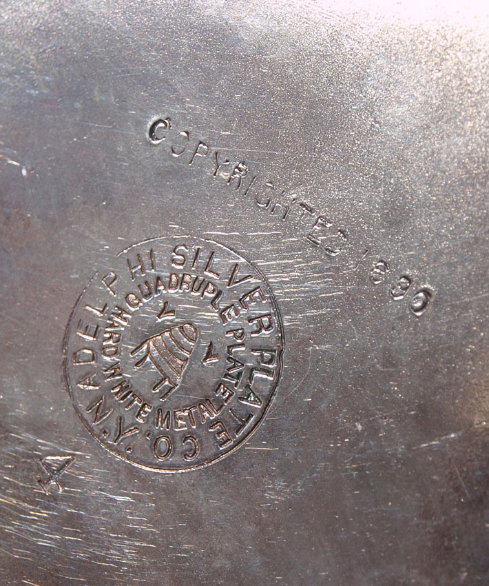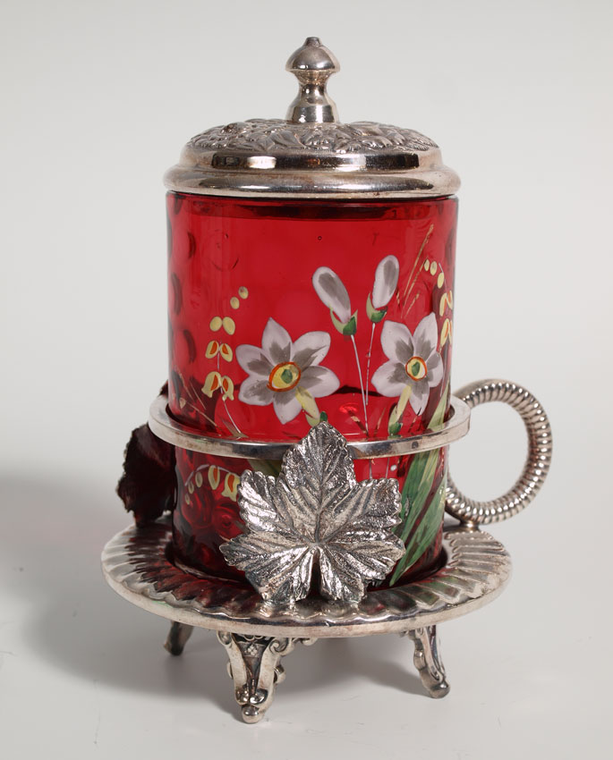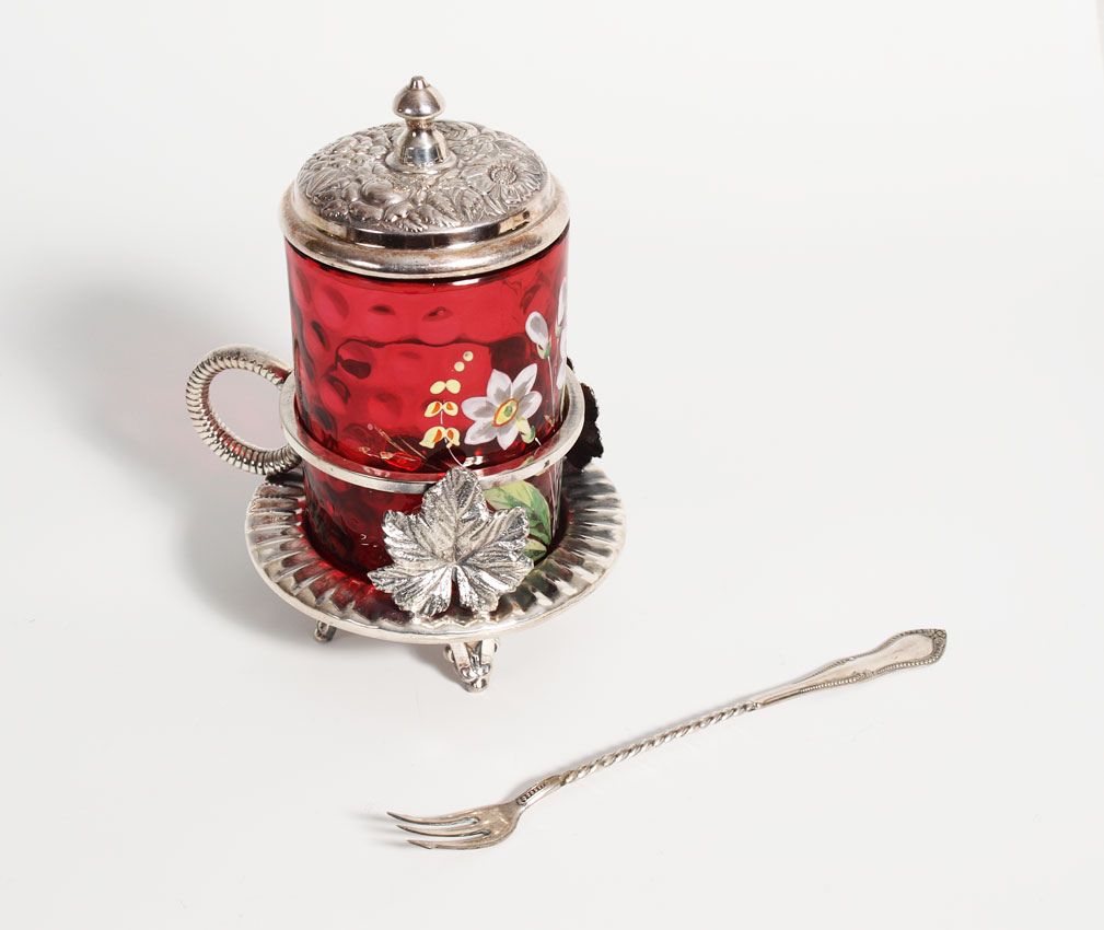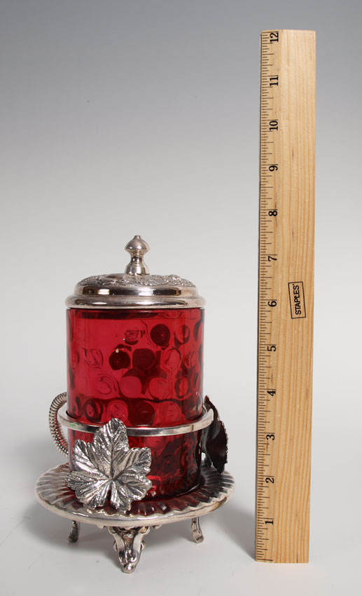 ADELPHI SILVER PLATE CO CRANBERRY GLASS PICKLE CASTOR: Pre 1915. Hand enameled cranberry glass nestled in an ornate silver plated stand with unusual side handle. 8''h. x 6''.