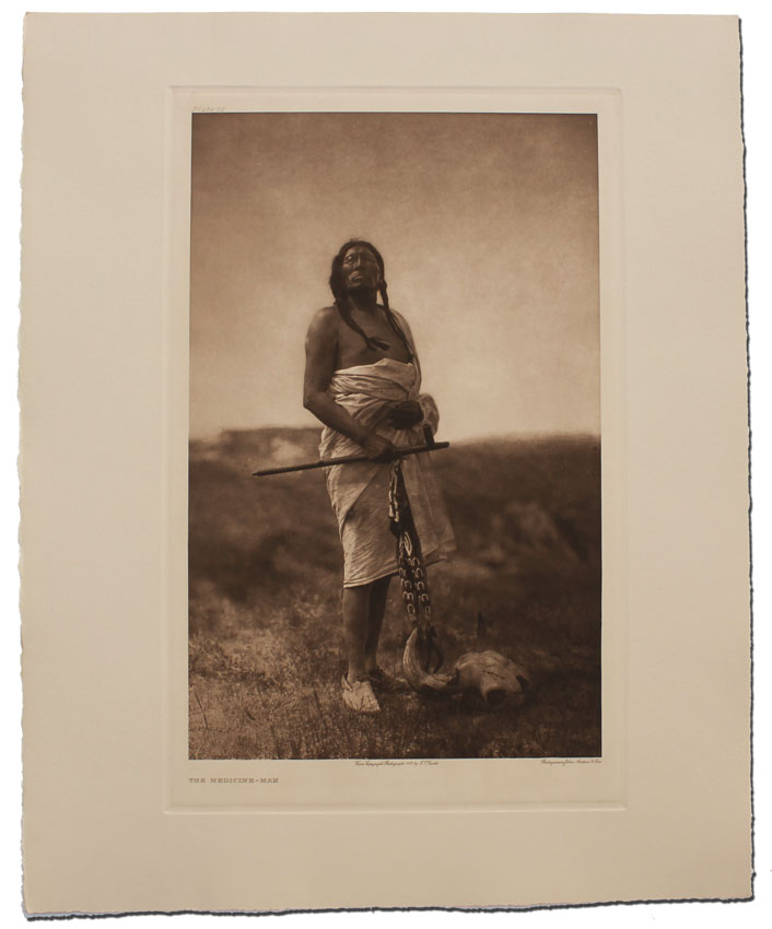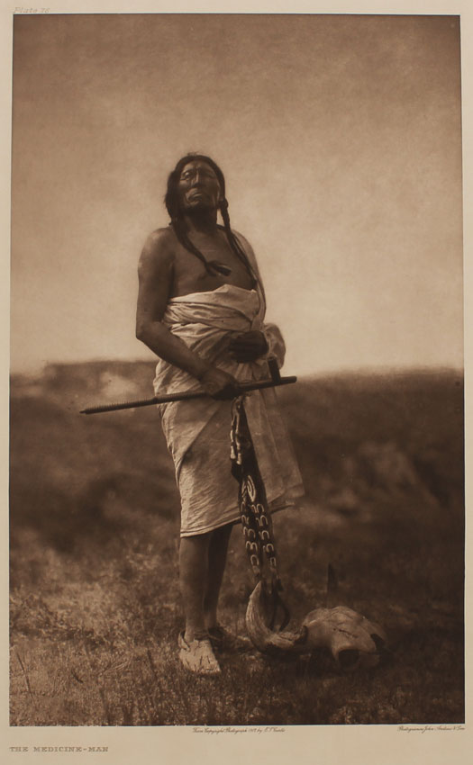 CURTIS, Edward, (American, 1868-1952): ''The Medicine Man'', Photogravure, 22 1/4'' x 18 1/4'', titled lower left, #'d plate 76 upper left, from copyright photograph 1907 by E. Curtis, photogravure by John Andrew & Sons, unframed. Finely printed from the original plate in 1982 by master printmaker, author and teacher Deli Sacilotto, edition size less than 15.