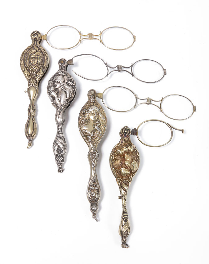 4 PIECE ART NOUVEAU STERLING LORGNETTES: To include 1) Woman with flowers, traces of vermeil wash. 5 1/4''. 2) Unger Brothers woman facing right with flowers, vermeil wash, one remaining eyeglass missing lens. 3) Illegible mark woman facing forward, vermeil wash. 4) Woman cupping flower, one lens missing and frame broken.