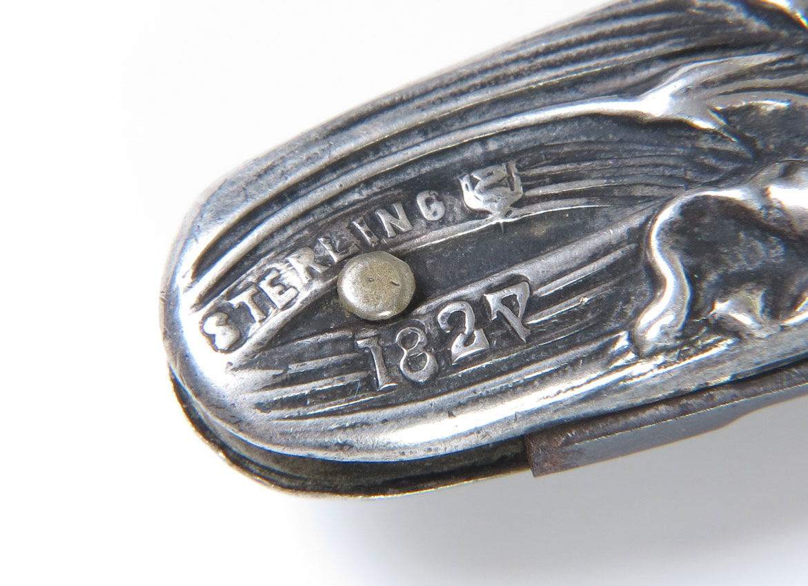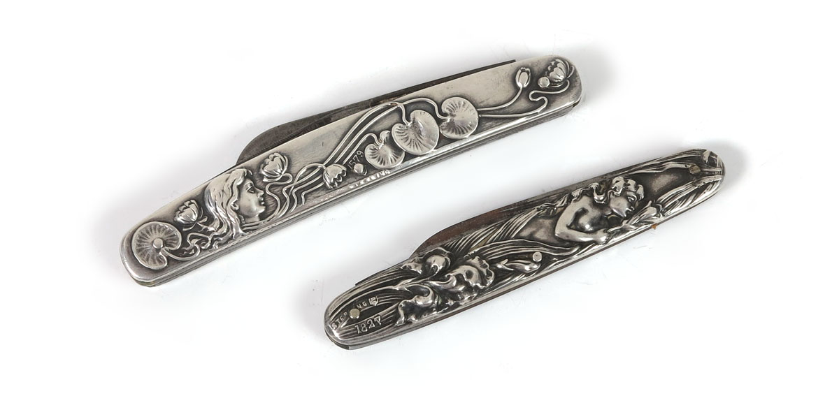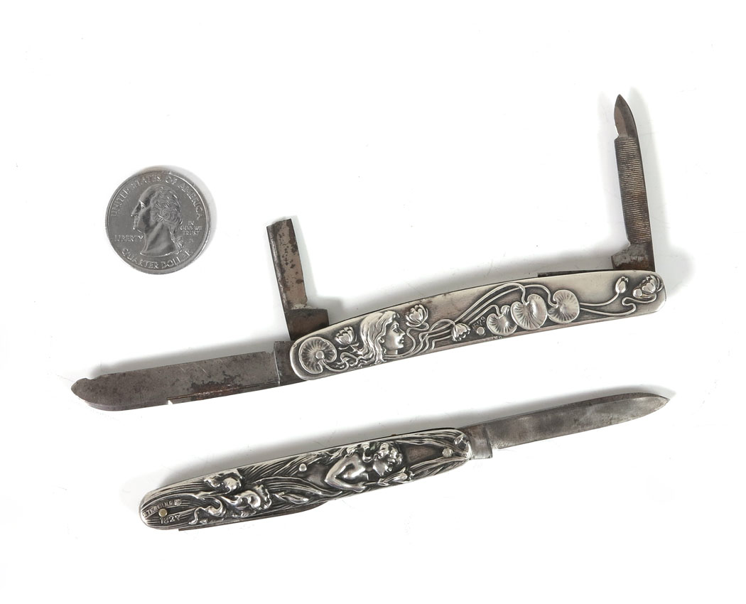 PAIR ART NOUVEAU STERLING POCKET KNIVES: To include 1) Simons Brothers full figured woman and floral motif. 2) Simons Brothers woman's head in profile with water lilies. 3 3/8'' l. closed.