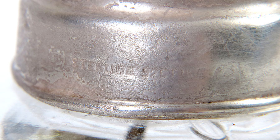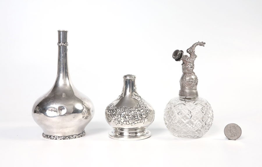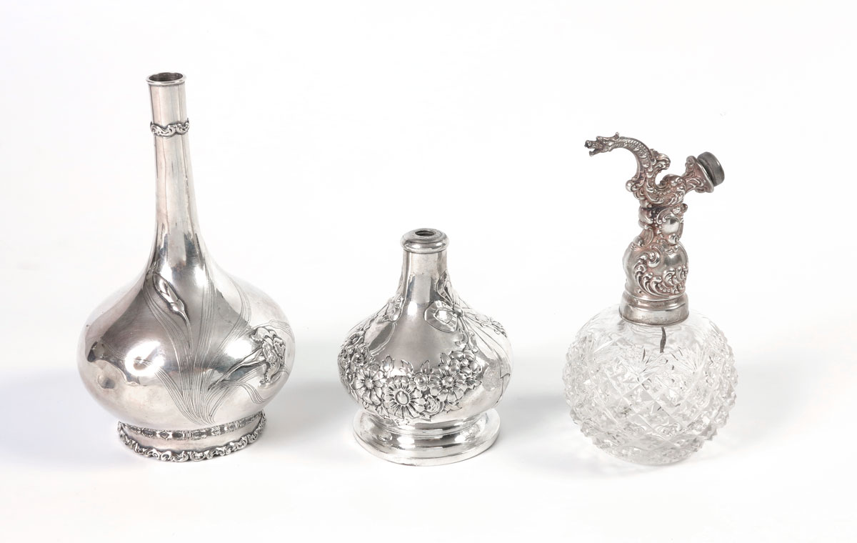 3 ART NOUVEAU STERLING & MOUNTED PERFUMES: To include 1) Whiting cattail and water lily pattern with long neck, #4031. Note several more noticeable dings. No stopper or mechanism. 6 1/2'' h. x 3 5/8''. 2) Alvin floral motif with ribbon, no stopper or mechanism. 3) Unger Brother sterling mounted top with dragon head finial, cut glass body. Not working. 5 3/4'' h. Approx. 8 troy oz. weighable sterling.
