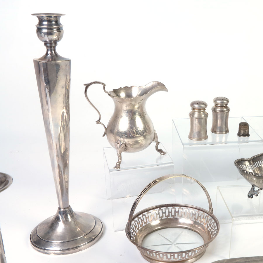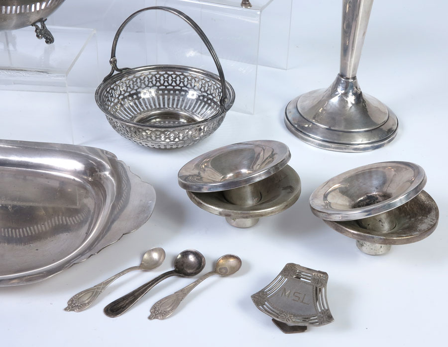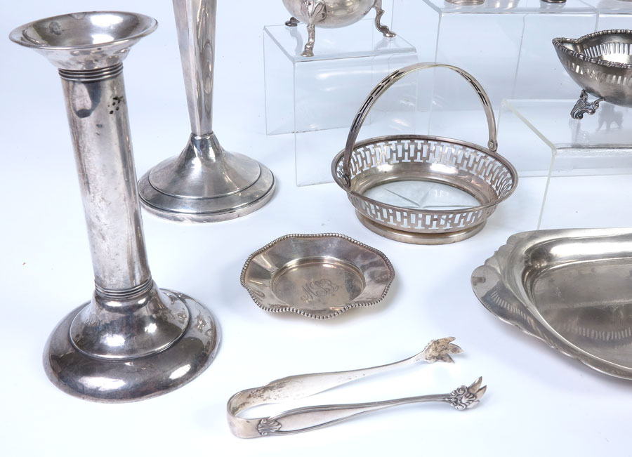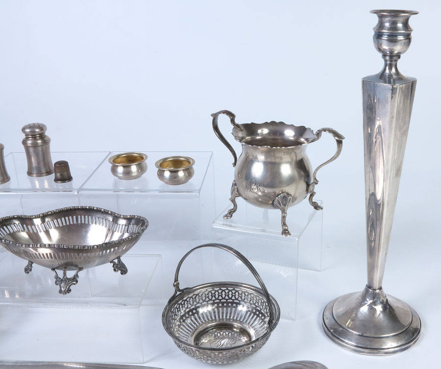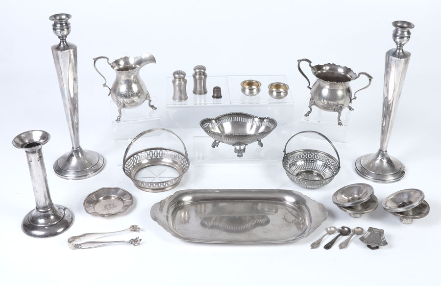 20 PIECE COLLECTION STERLING SILVER ITEMS: An assembled collection to include creamer & sugar, nut trays, tray, salt dish and spoons, open salts, sugar tongs, 3 weighted sterling candlesticks and more. Approx. 24.8 troy oz.