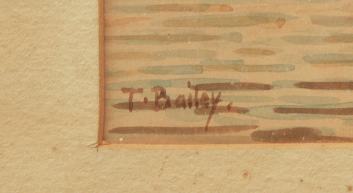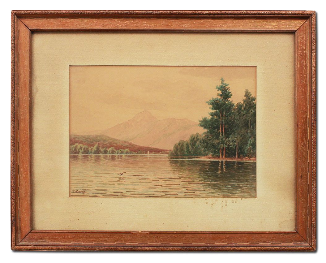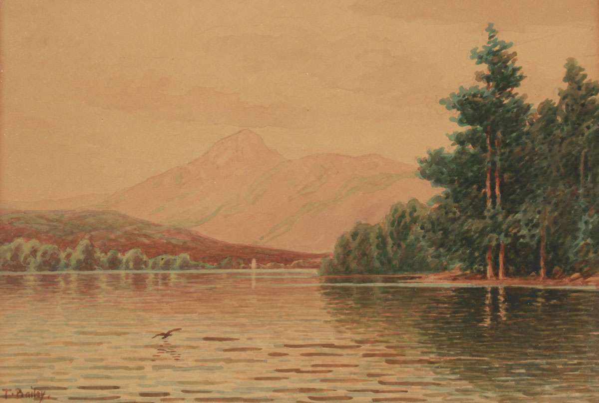 PASKELL, William Frederick, (American, 1866-1951), (under pseudonym T. Bailey): White Mountain river Landscape with possibly Mount Chocura in the Background, Watercolor, Sight size 9 1/2'' x 13 1/2'', signed lower left, period frame with wear 17 1/2'' x 22 1/2''.