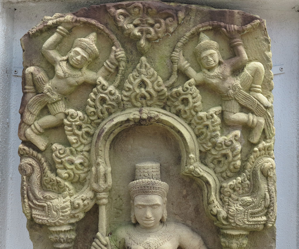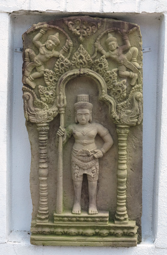 CAMBODIAN CARVED SANDSTONE FRIEZE: Frieze having high relief decoration of a standing warrior holding a spear in temple doorway with Gods in upper corners. 35'' high x 18'' wide x 5'' diameter. Actual age unknown. From the Estate of John Desmond and his wife Janina Hardoon Desmond.