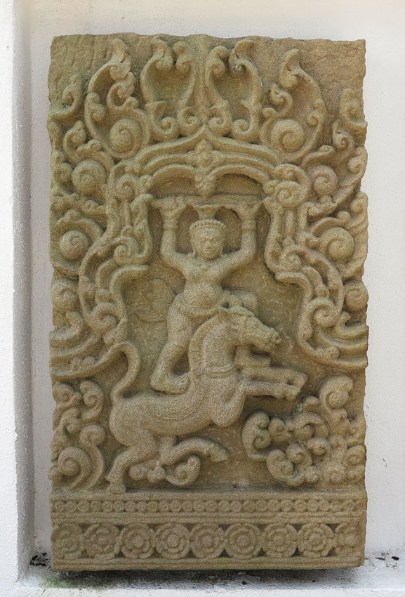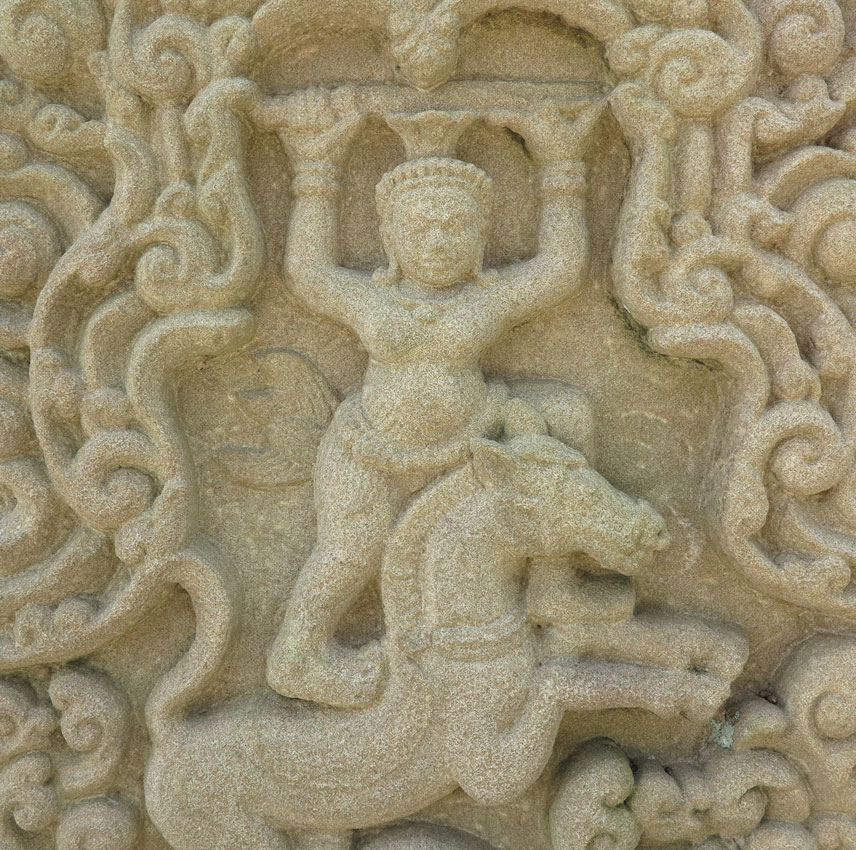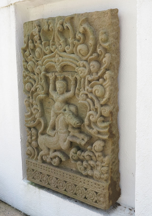 CAMBODIAN CARVED SANDSTONE FRIEZE: Frieze with high bas relief of warrior standing on charging horse in temple doorway within allover scrolls design on base floral border, 31'' high x 18'' wide x 3'' diameter. Actual age unknown.