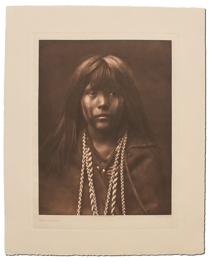 CURTIS, Edward, (American, 1868-1952): ''Mosa-Mohave'', Photogravure, 22 1/4'' x 17 3/4'', titled lower left, #'d plate 61 upper left, from copyright photograph 1903 by E. Curtis, photogravure by John Andrew & Sons, on Arches Paper. Finely printed from the original plate in 1982 by master printmaker, author and teacher Deli Sacilotto, edition size less than 15.