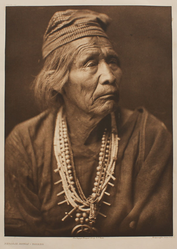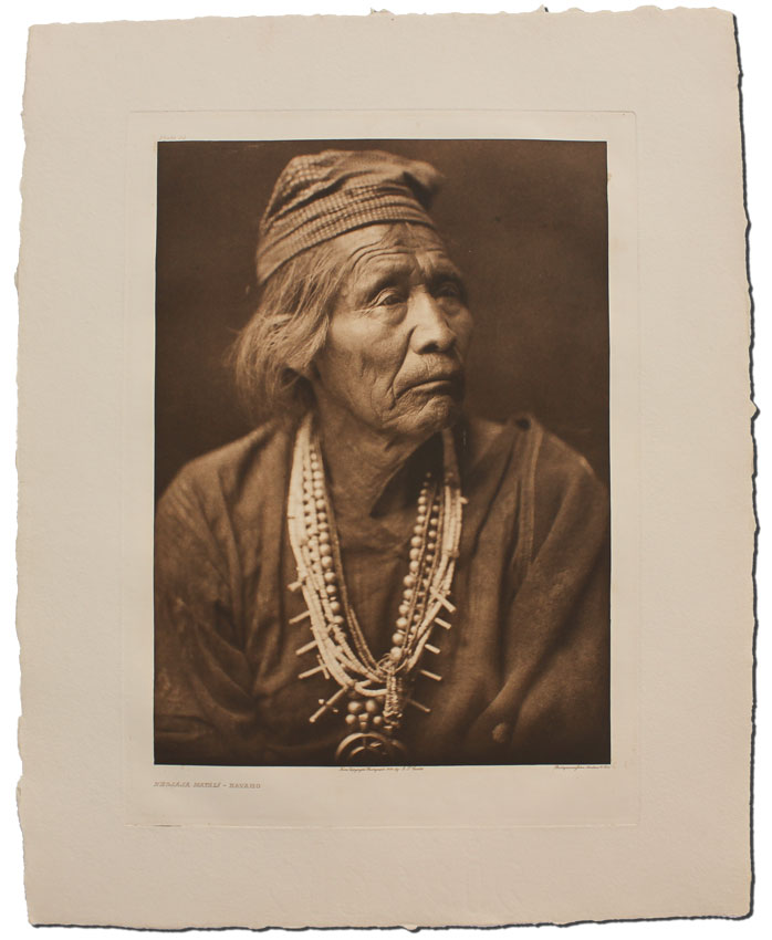 CURTIS, Edward, (American, 1868-1952): ''Nesjaja Hatali-Navajo'', Photogravure, 22 1/4'' x 18 1/4'' titled lower left, #'d plate 31 upper left, from copyright photograph 1904 by E. Curtis, photogravure by John Andrew & Sons, on Classic Paper, unframed. Finely printed from the original plate in 1982 by master printmaker, author and teacher Deli Sacilotto, edition size less than 15.