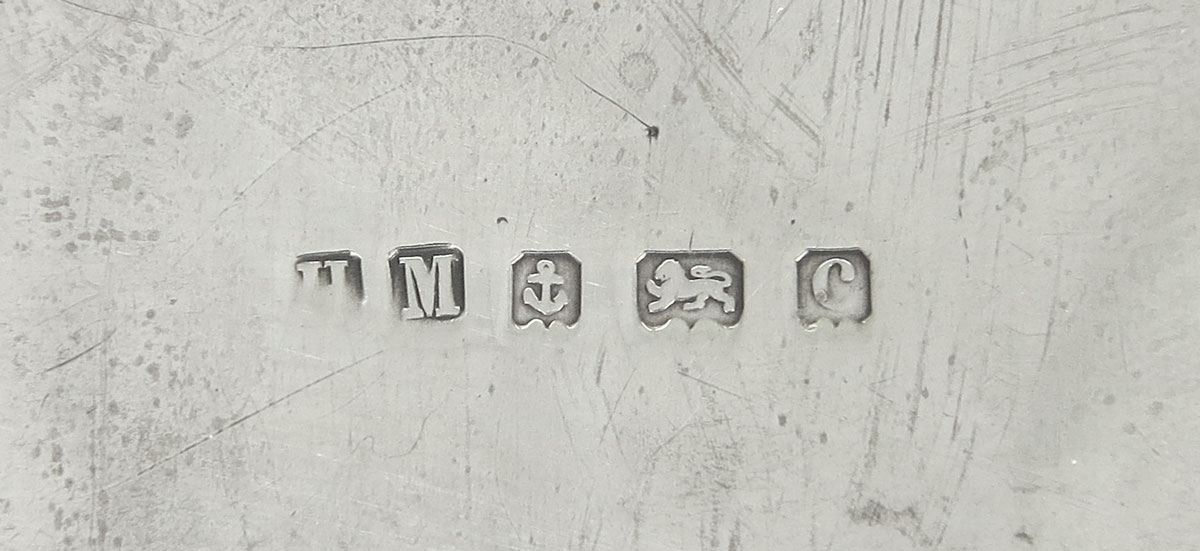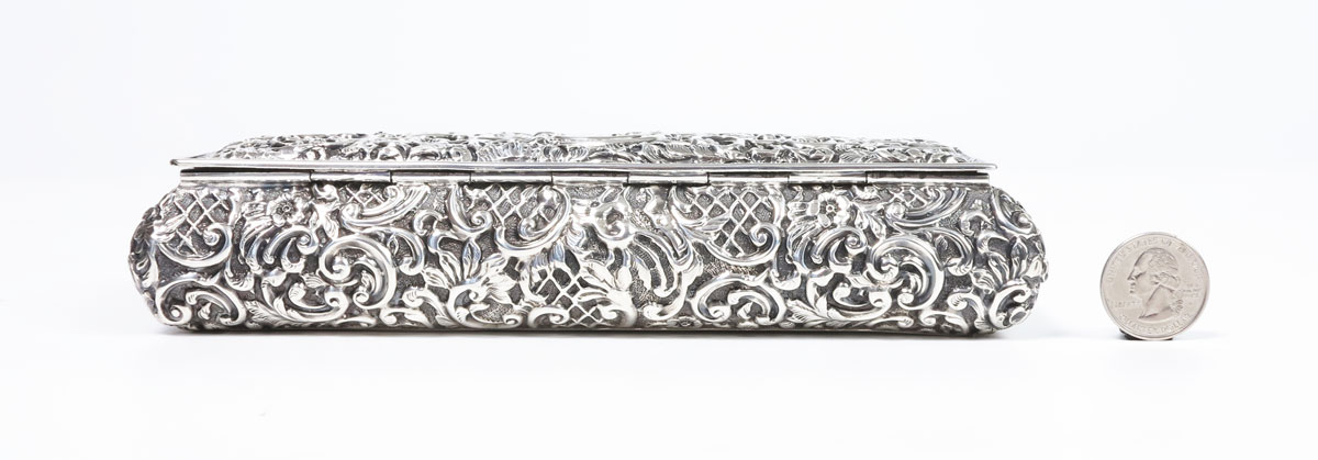 1902 HENRY MATTHEWS ENGLISH SILVER DRESSER BOX: Embossed with foliate scroll motif, hinged lid, hallmarked with Henry Matthews, Birmingham, 1902 English hallmarks. Monogrammed ''C''. Measures 1 3/4'' x 8'' x 3''. Approx. 8.8 troy oz.