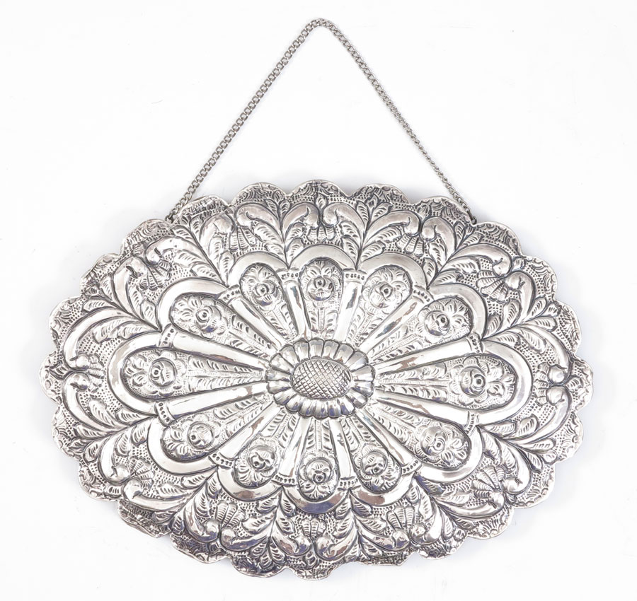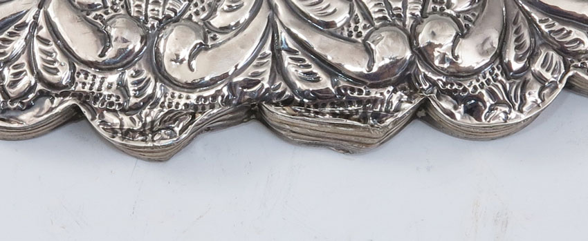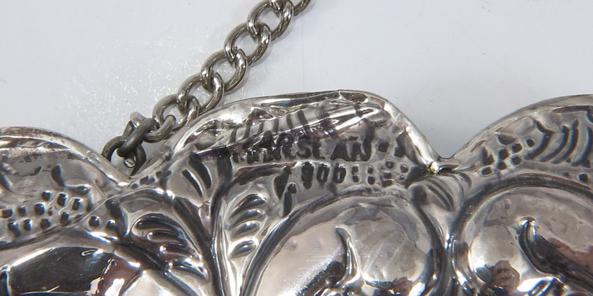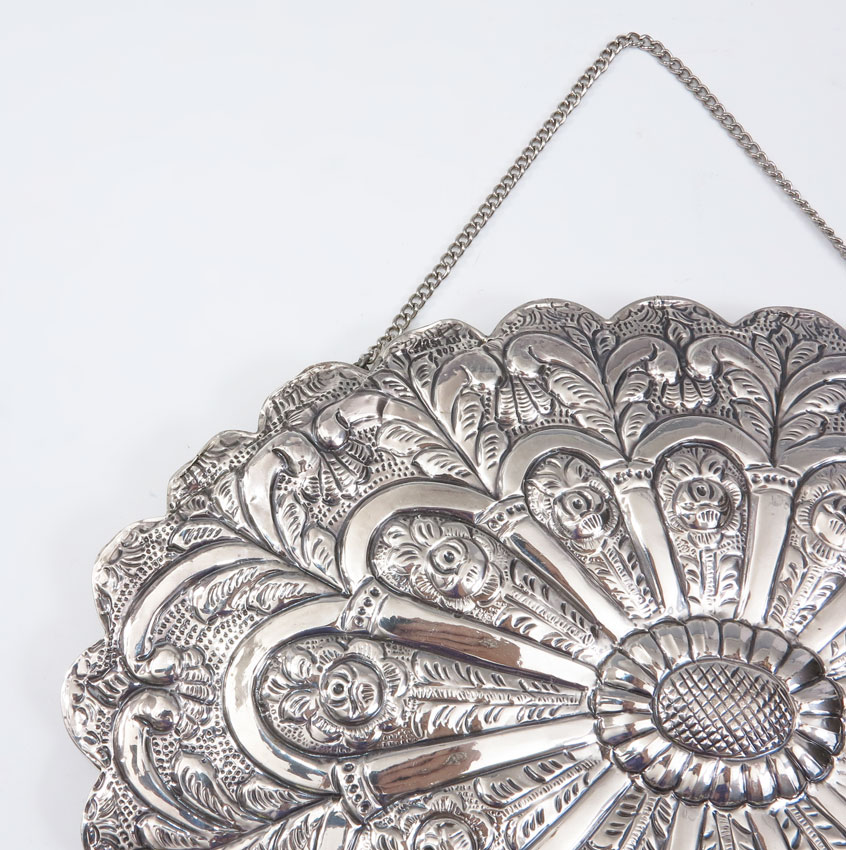 EMBOSSED STERLING FRAME MIRROR WITH CHAIN: Engraved front with embossed floral motif back. Marked on back with makers hallmark ISIL, 925. 9 1/4'' x 7''. Sold with original box.