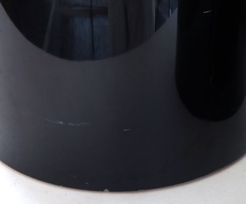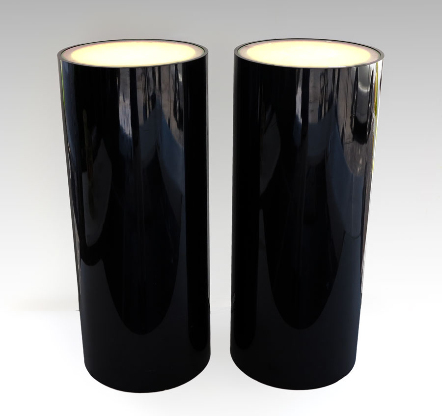 PAIR GLASS TOP UP LIGHT DISPLAY PEDESTALS: Frosted glass tops with black veneer bodies. 38'' h. x 16''.