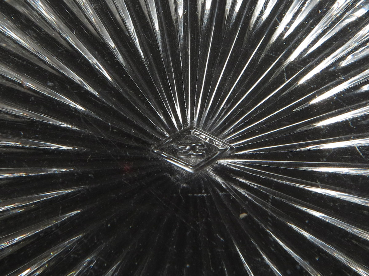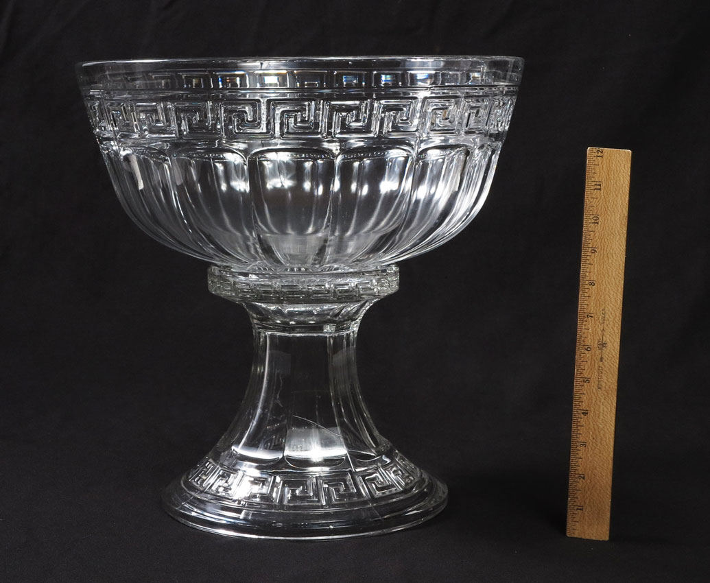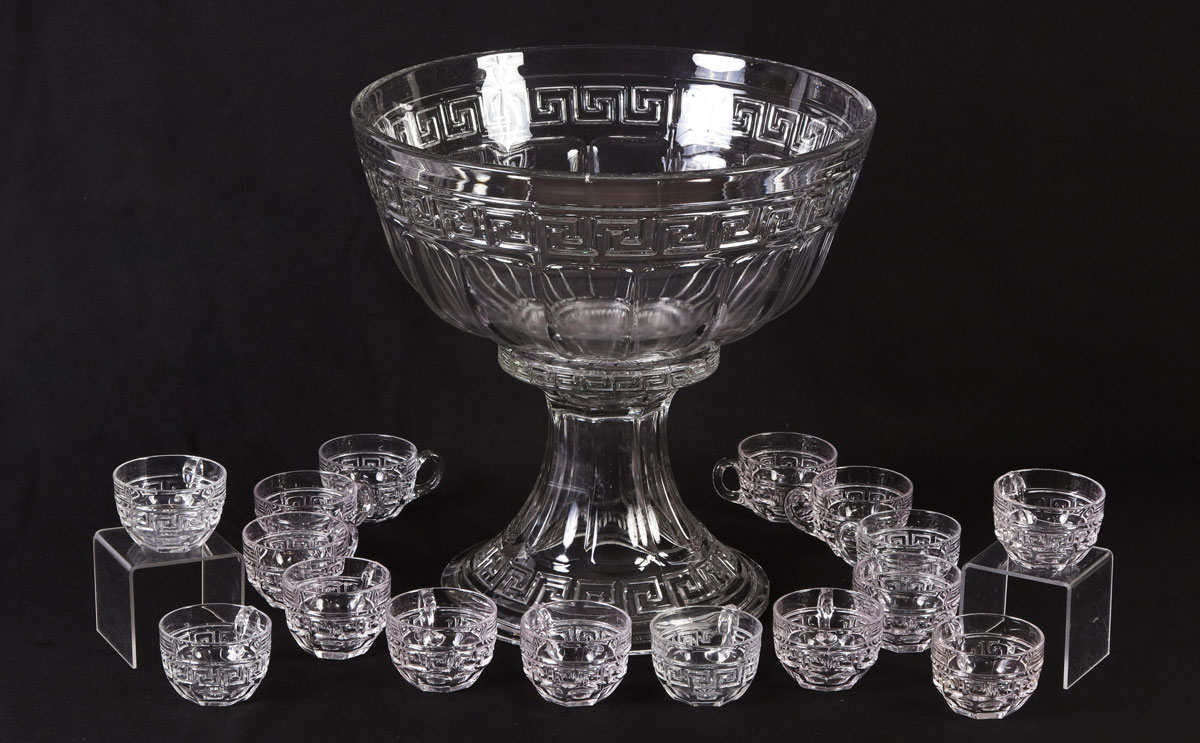 HEISEY GREEK KEY PUNCH BOWL WITH STAND & 16 CUPS: Bowl 7 3/8'' h. x 14 1/2'', base 8'' x 9 1/2'', cups 2 1/4'' x 3 3/4''.