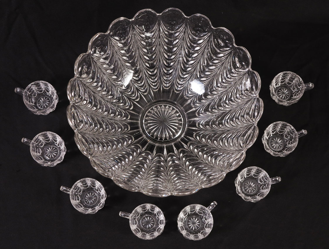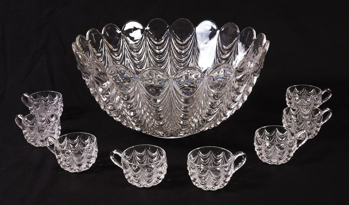 FOSTORIA HEAVY DRAPE PUNCH BOWL & 8 CUPS: Bowl 8'' x 16'', 8 cups 2 1/4'' x 4 1/4''.