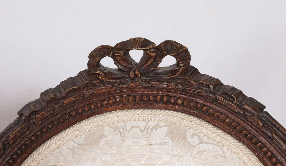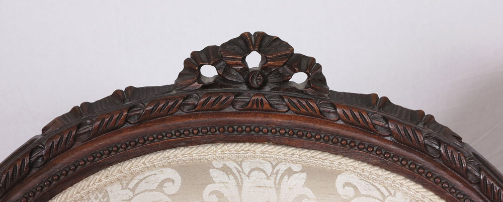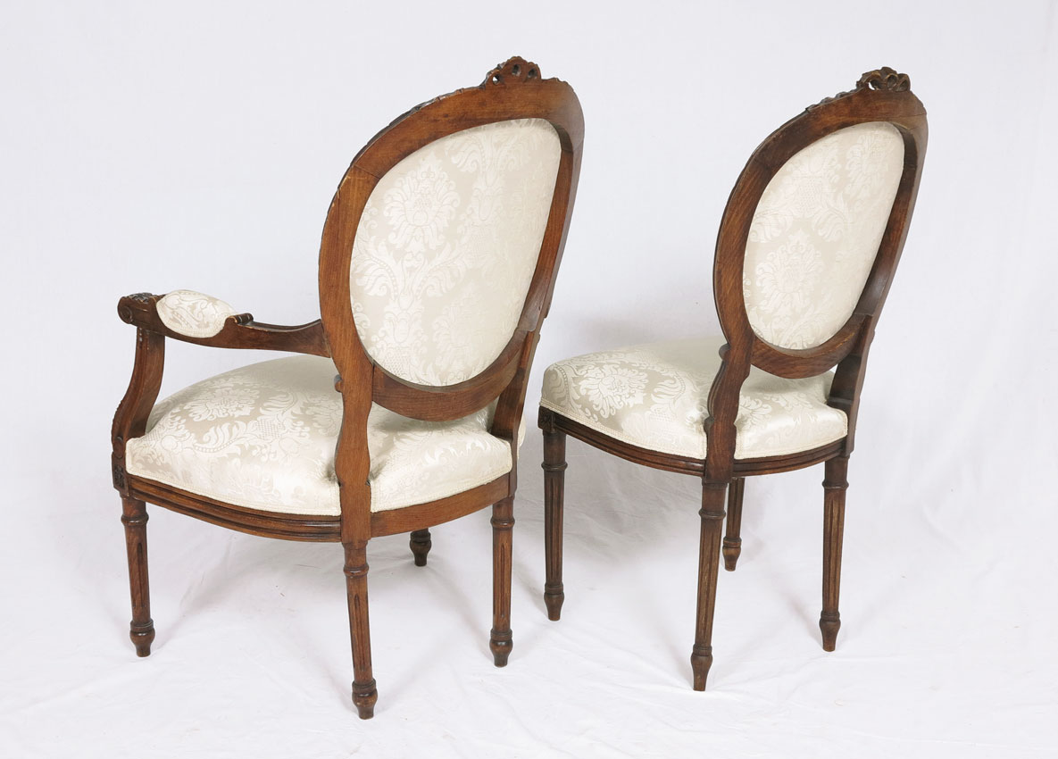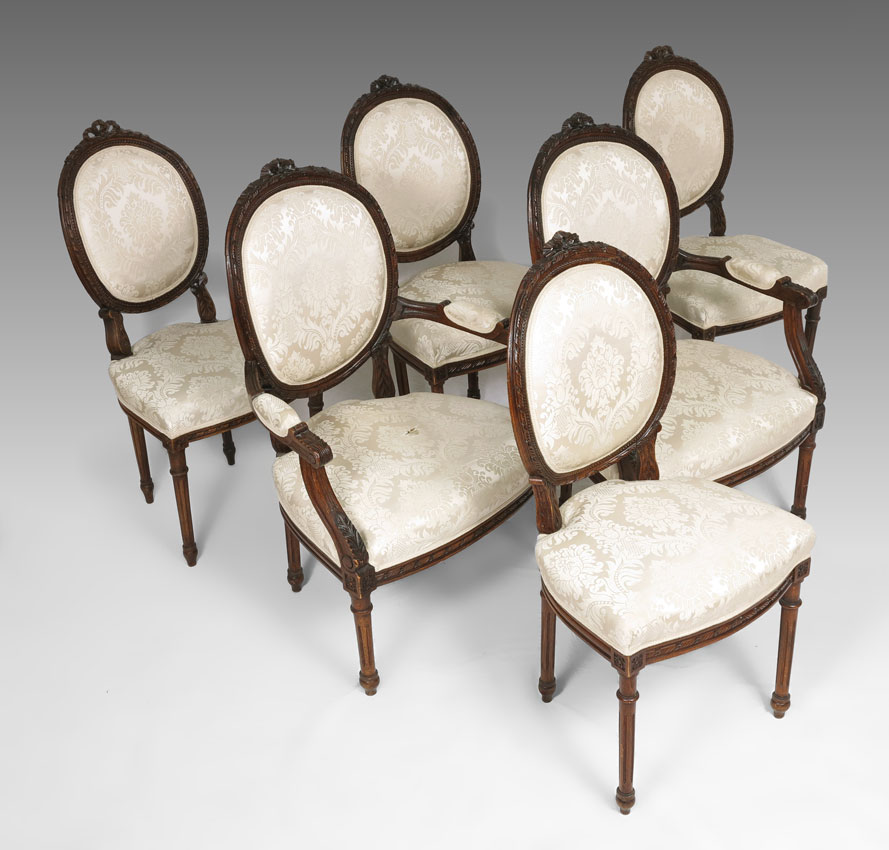 6 FRENCH STYLE CARVED DINING CHAIRS: 2 arm and 4 side chairs, carved frames with carved and turned legs. Ivory upholstery with French style pattern. Arm chairs 38 3/4'' h. x 25 1/4'' x 25''