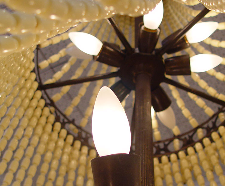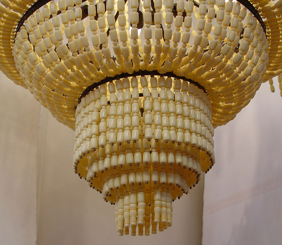 PALATIAL 7 FT TALL 6 TIER CHANDELIER CALLED ''THE DE LA AZIZE'': Imported by Asia Minor Carpets. Faux ivory beads draped on a metal frame. Approx. 7' h. x 4'5'' dia.