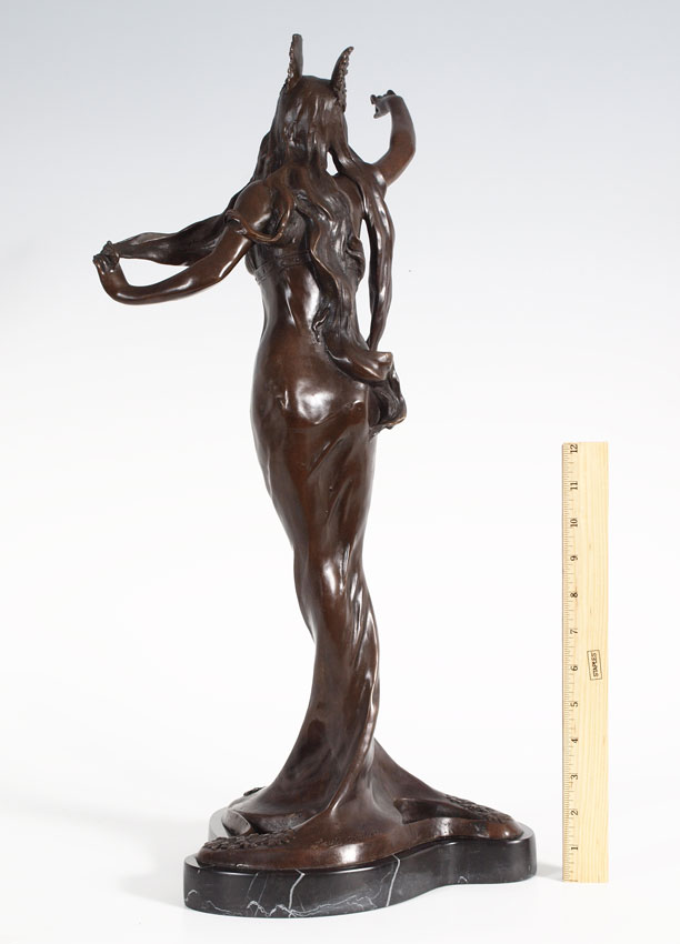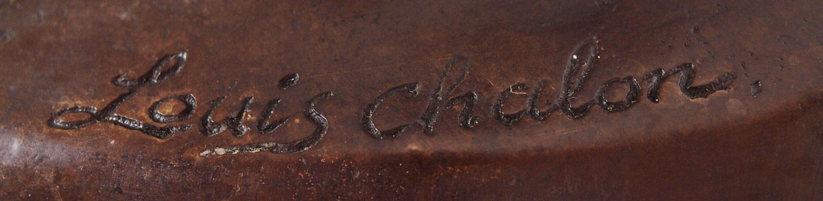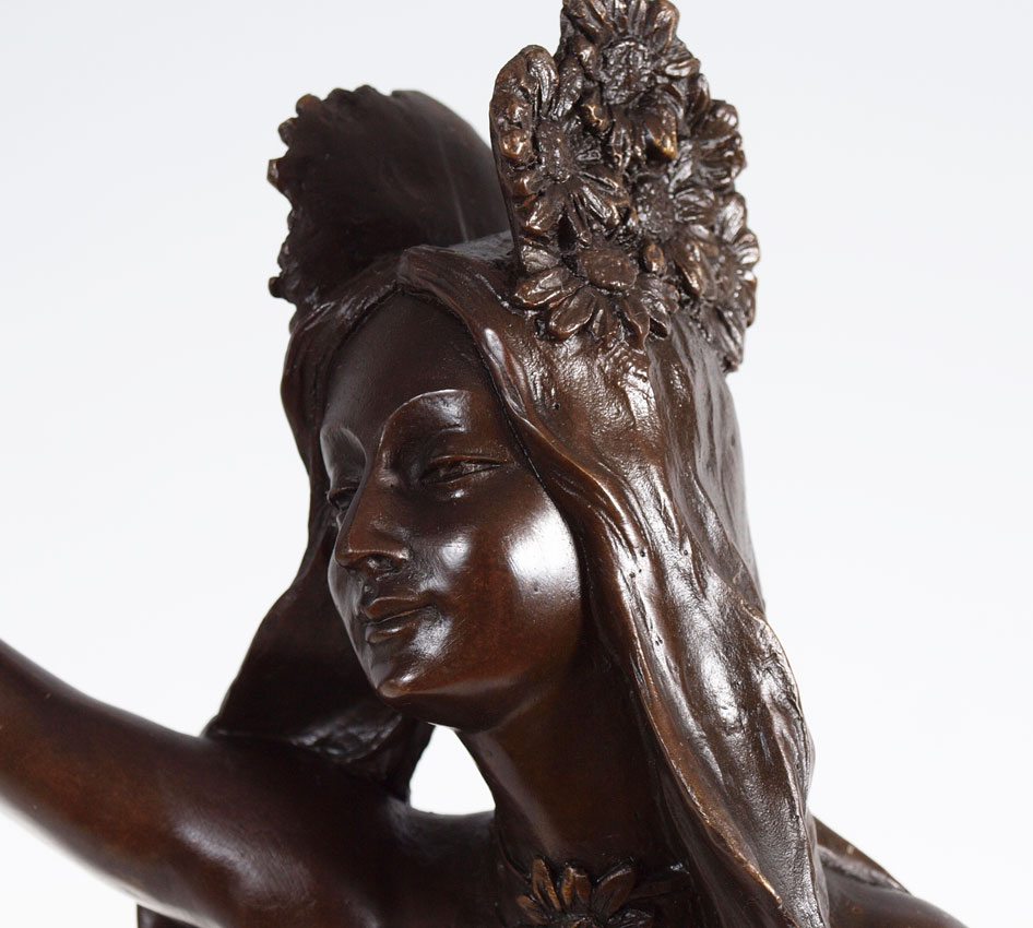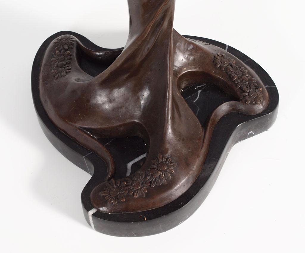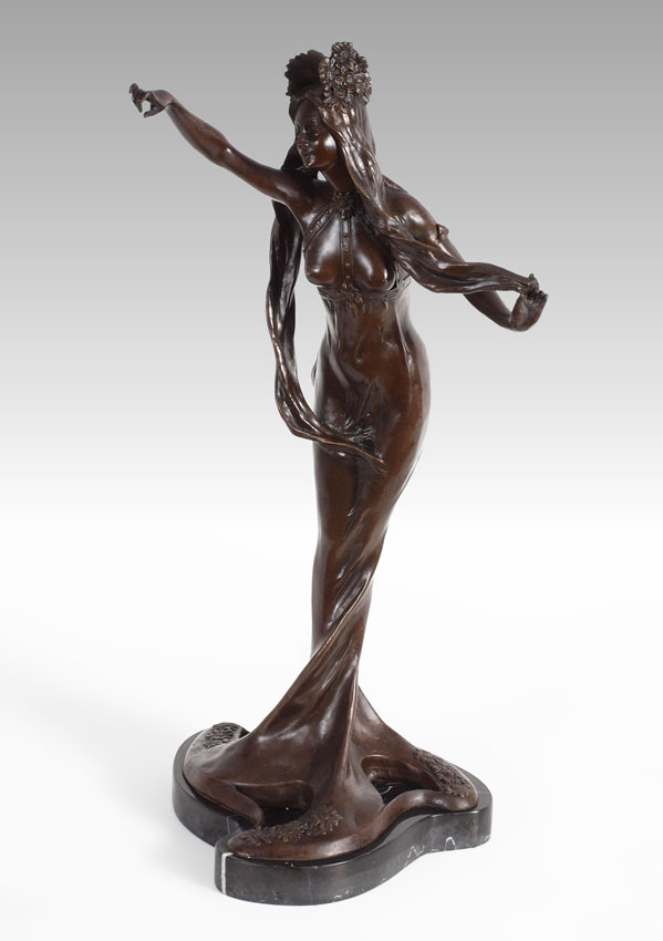 ART NOUVEAU STYLE ENCHANTING MAIDEN BRONZE AFTER LOUIS CHALON: Bronze, 22'' h., affixed to a variegated marble plinth, 32 1/2'' overall, incised signature.