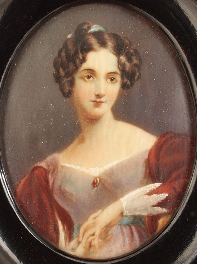MINIATURE PORTRAIT PAINTING ON IVORY OF A YOUNG MAIDEN MONOGRAMMED HS: oval sight size 3'' x 2 1/4'', painting wood frame, 5 1/2'' x 4 5/8''.