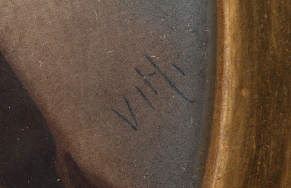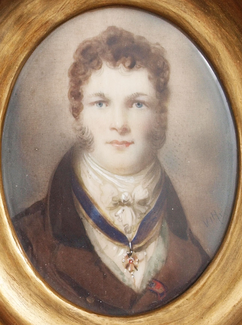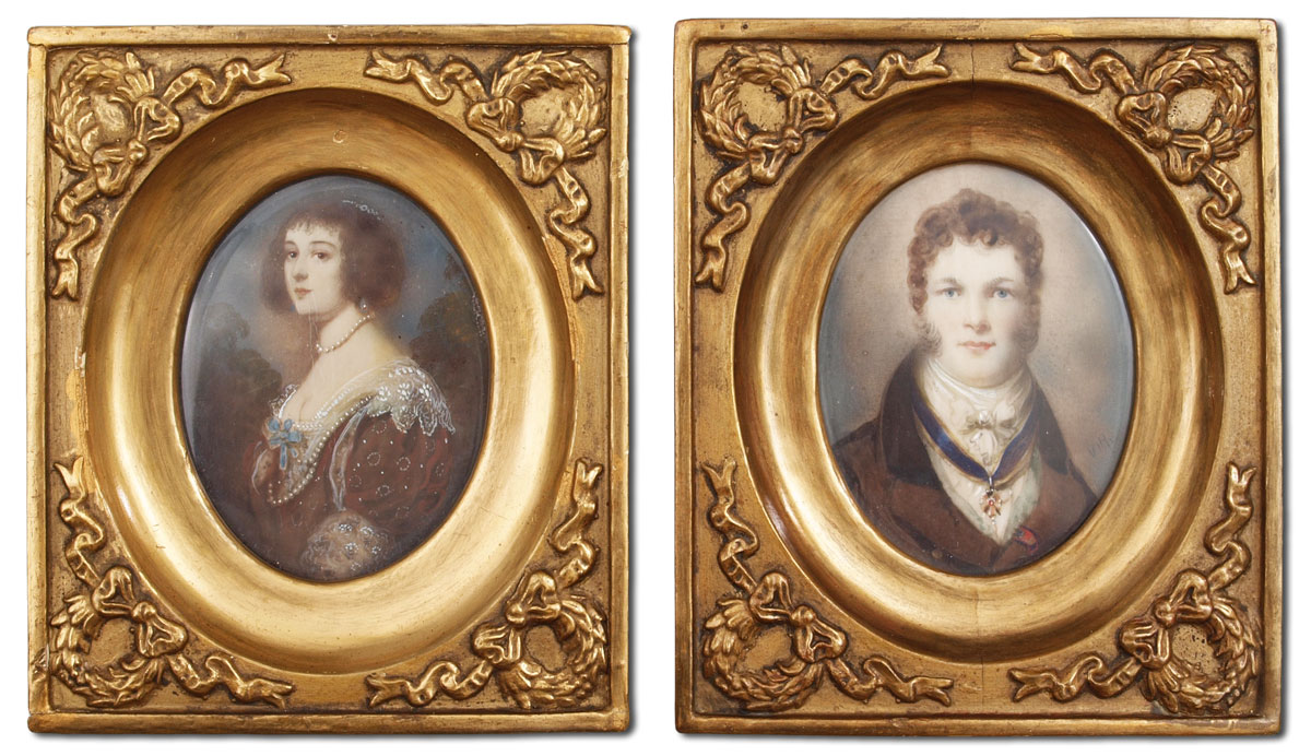 TWO MINIATURE PORTRAITS ON IVORY: 1) Young Gentleman wearing a Metal, oval sight size 3'' x 2 1/2'', signed Vitti? 2) Young Female of Nobility, oval sight size 3'' x 2 3/8''. They are encased in matching gilded and carved frames with minor wear, 5 3/8'' x 4 5/8''.