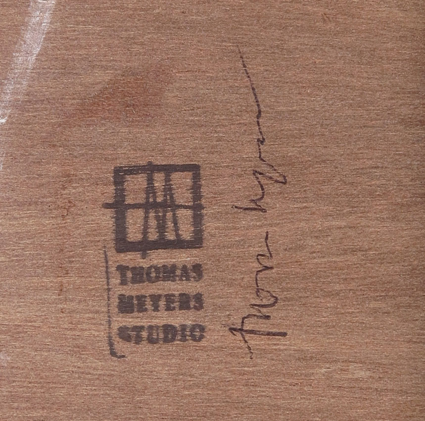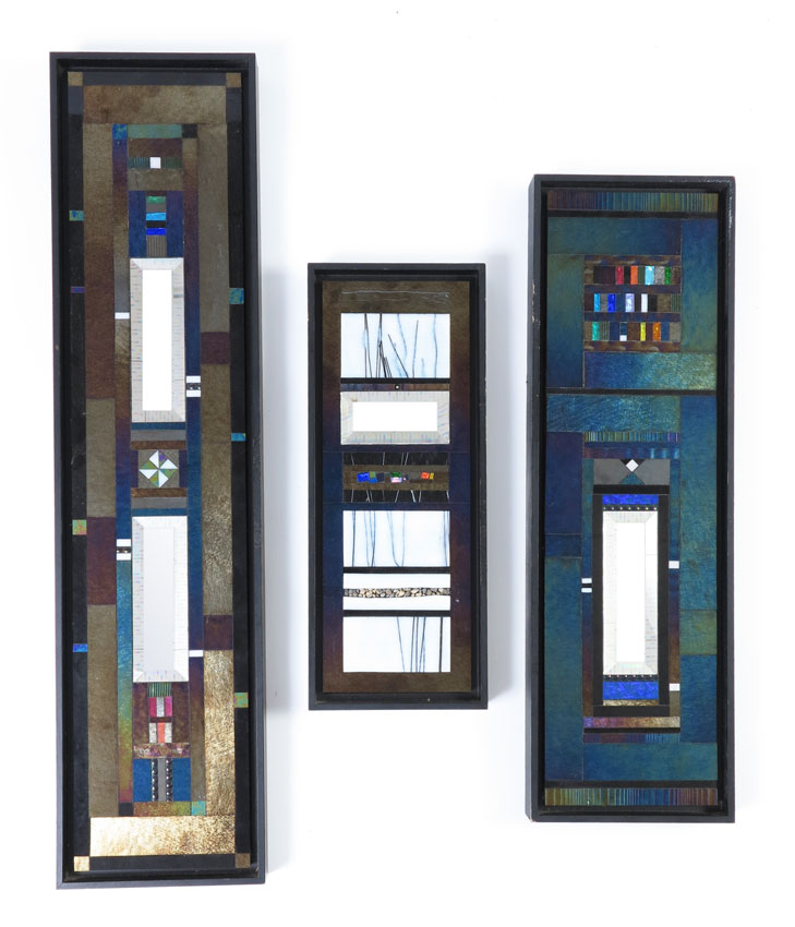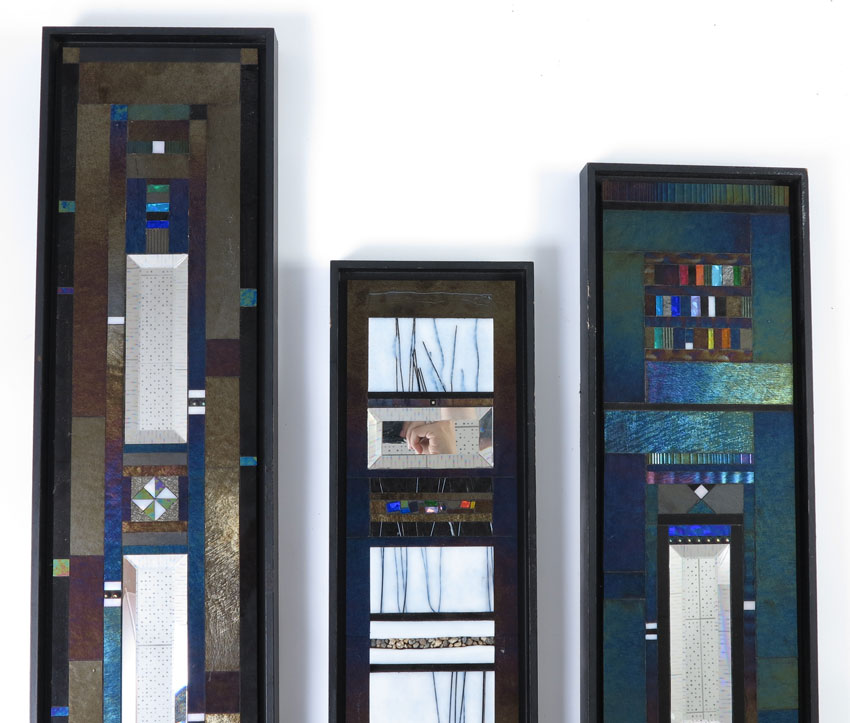3 PIECES THOMAS MEYERS STUDIO: Framed Decorative Mosaic Glass Panels, Graduating in size from 23 1/2'' x 7 1/2'' down to 16 1/4'' x 6 1/2'', stamped and signed verso, frames do show wear.