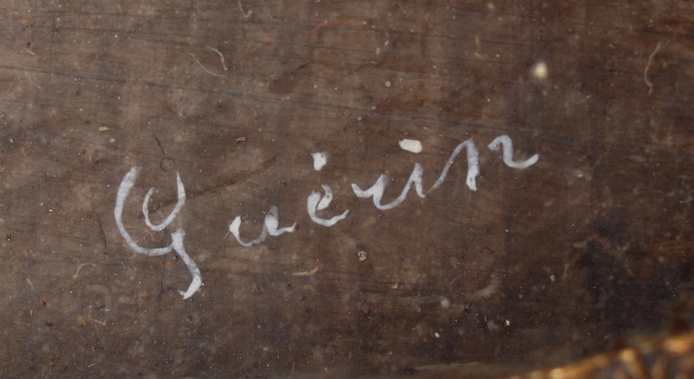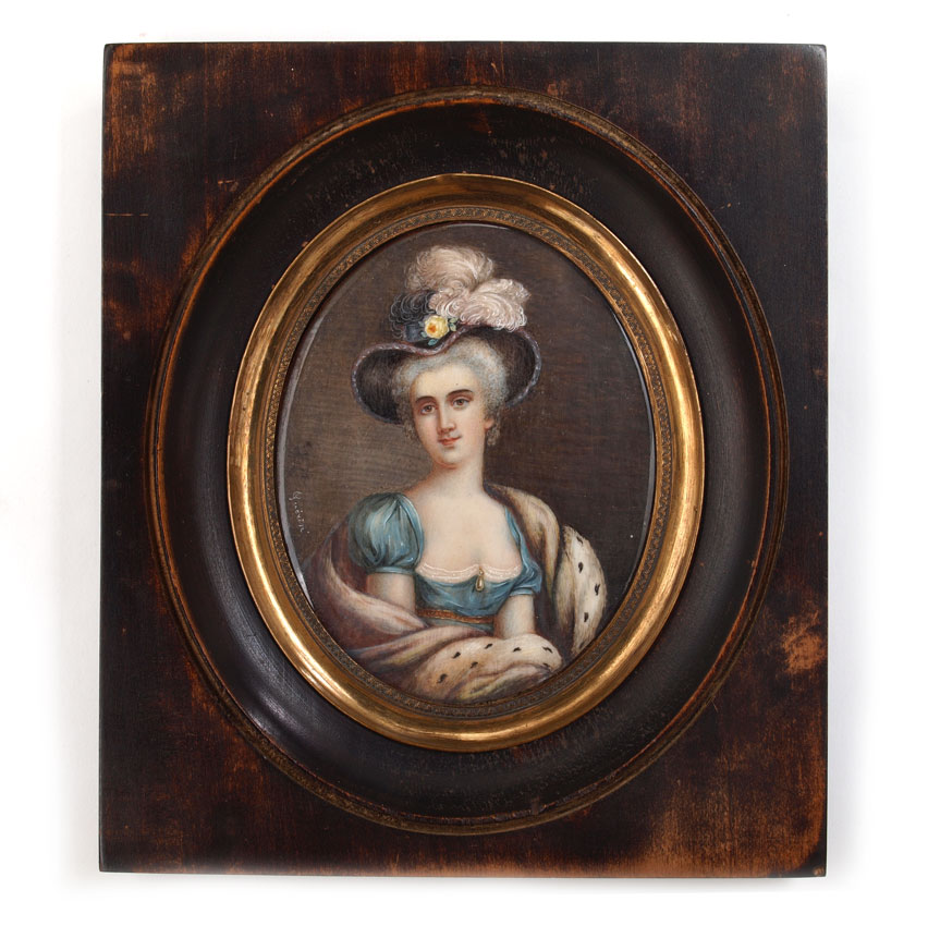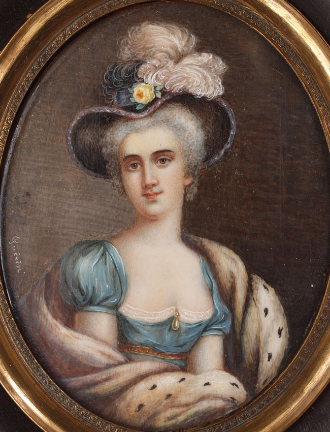 LARGE MINIATURE PORTRAIT PAINTING SIGNED GUERIN: Oval sight size, 4 1/4'' x 3'', signed in the left margin, encased in finger carved wood frame, 6 5/8'' x 5 3/4''.
